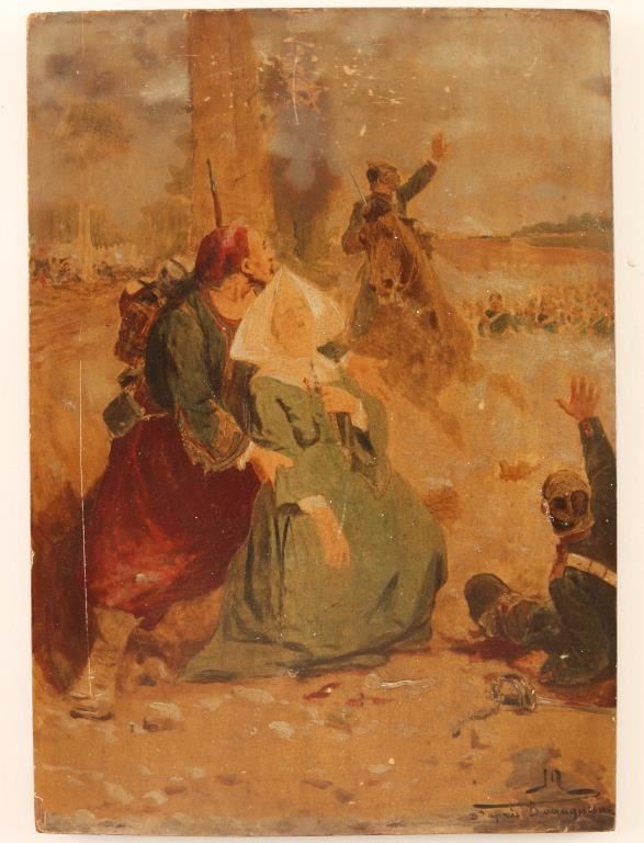Soldiers in the background advancing on a gentleman who is assisting an injured nun. Signed lower right. Some scratches at top center of piece. Measures 8"x11 1/2". Label on back from 'Jardin des Tuileries'.