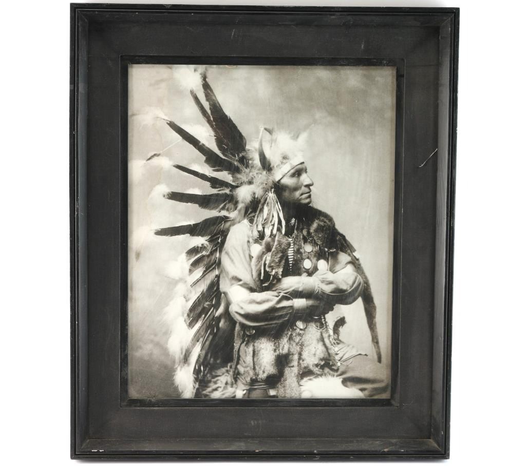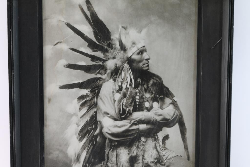 Framed picture of a Native American wearing a long headress with horns, animal furs and conchos while looking off into the distance.