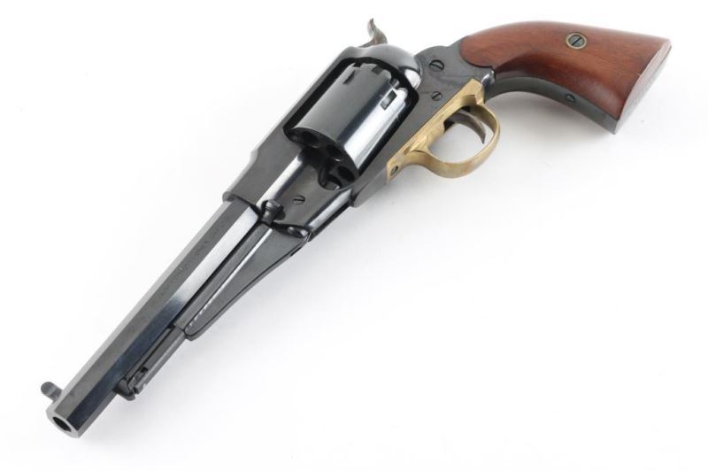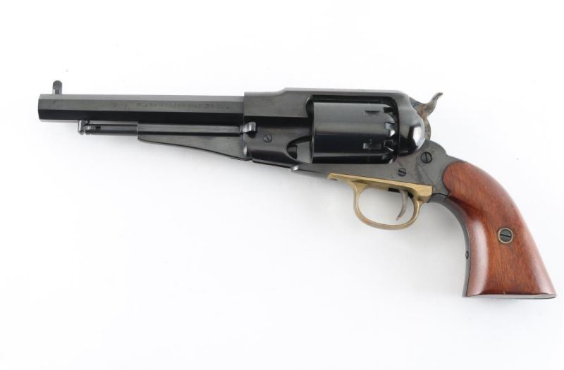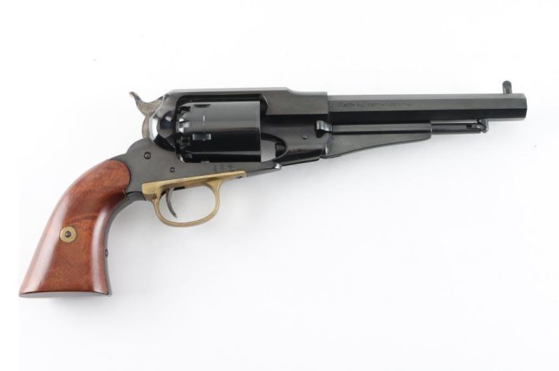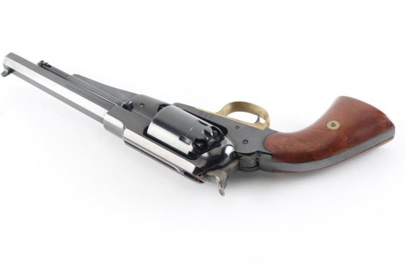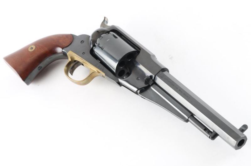 Black powder only. Italian made reproduction of the 1858 Remington Navy Beals revolver. It features a blued finish, 6.5" octagonal barrel, pinched post front sight, notched rear sight, loading lever, non-fluted six shot cylinder, smooth trigger, brass trigger guard, case hardened hammer with serrated spur, and two piece smooth wood grips. Revolver shows little to no wear with a faint drag line on the cylinder. Action is smooth, bore looks good and grips are fine. Condition is NRA Very Good ***Antique Firearm***