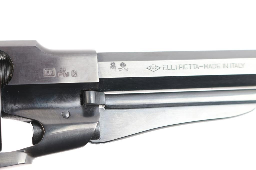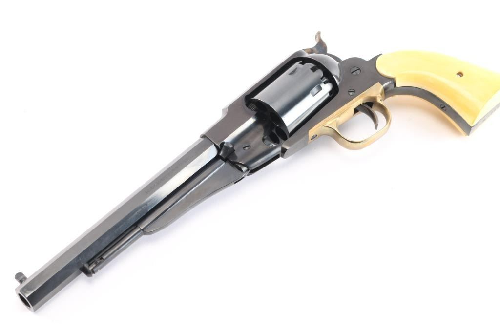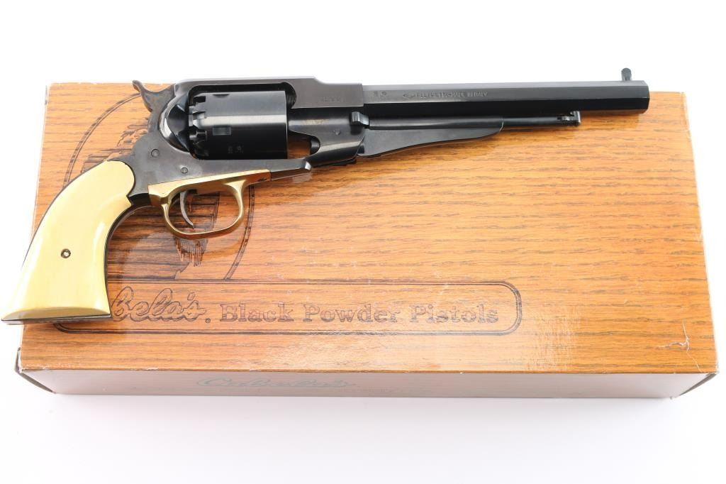 Italian replica of the Remington New Model Army design black powder "Cap 'n' Ball" single action revolver. Features blued finish, case colored hammer, and trigger, brass trigger guard, smooth wood factory grips (Included) have been replaced with a nice set of Tombstone Gun Grips aged ivory grips, 8" octagon barrel, loading lever, blade front & fixed notch rear sights. Appears unfired, with excellent condition bore & charge holes. Finish is excellent , excellent grips. Comes with factory box with matching label, manual and factory grips. Also included is a nice black leather 'Slim Jim' style holster with floral designs, like new.