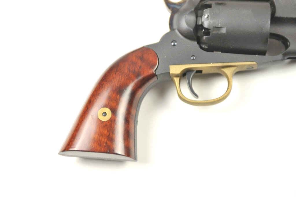 Pietta 1858 Remington reproduction black powder revolver, #A19966, matte black finish with brass trigger guard, color case hardened hammer, and walnut grips. The revolver is in fine condition overall, retaining themajority of it’s matte finish. The action is very good, grips are great, bore is bright and the revolver appears unfired. Includes the original box. (Exempt) Est. $175-350