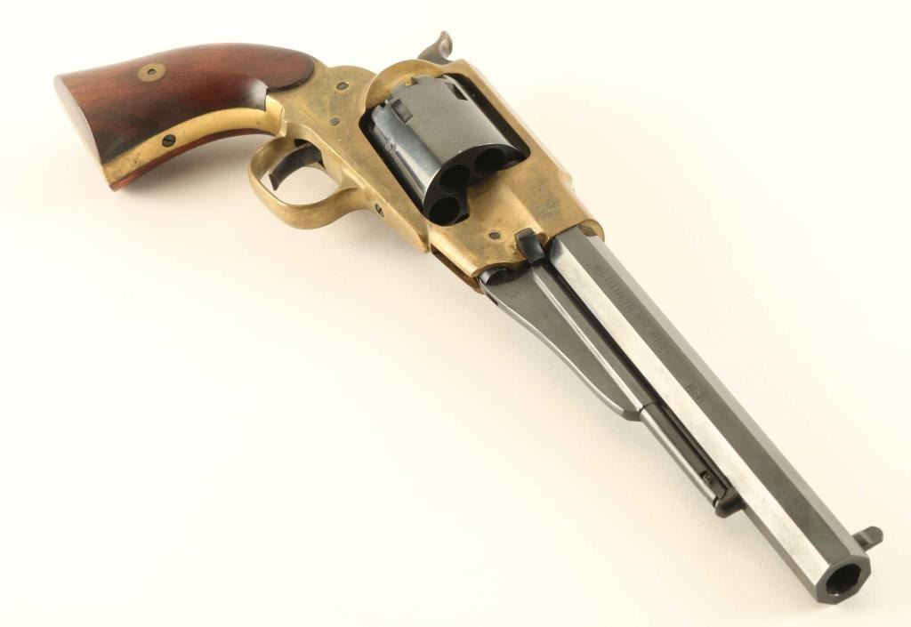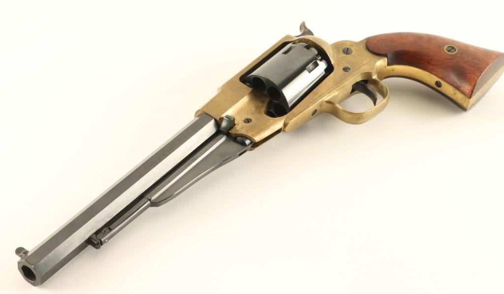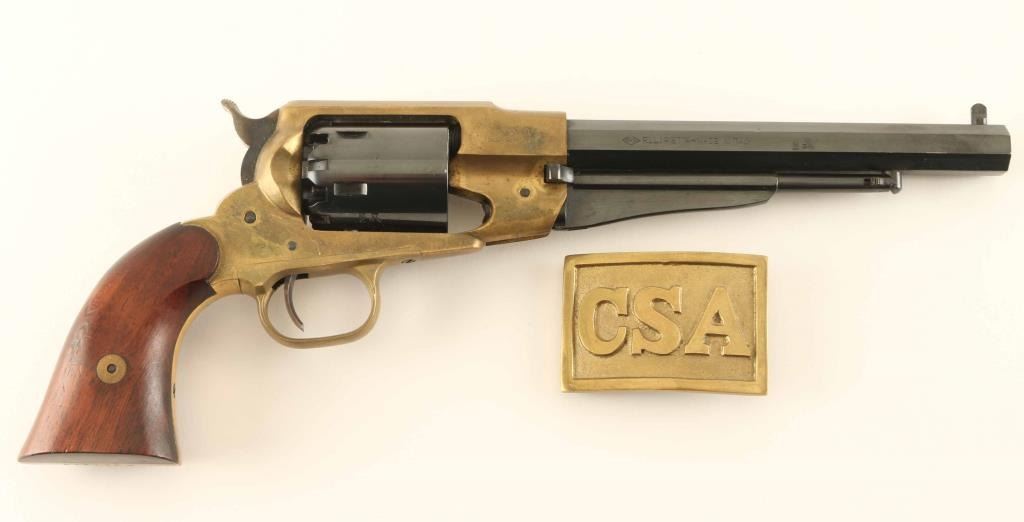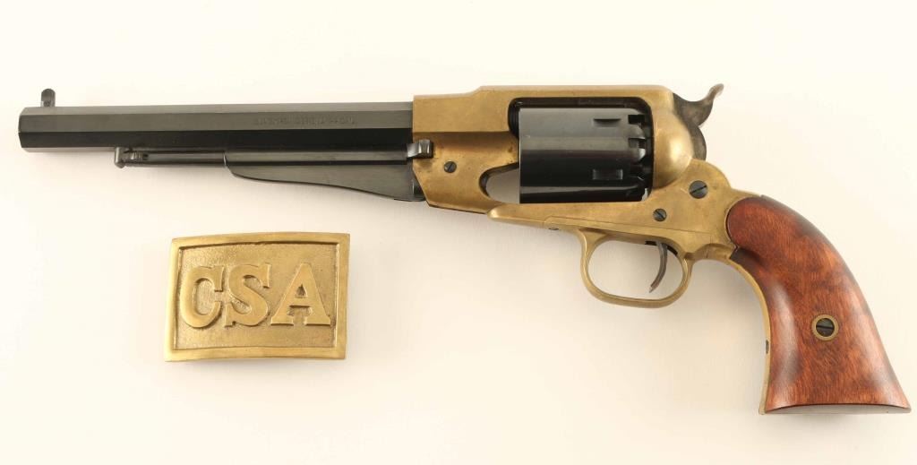 “Confederate” style brass frame revolver in .44 percussion caliber inspired by Remington design, S/N R417312. Fine to excellent condition. No signs of firing. Minimal handling and excellent overall. With buckle. Condition is NRA Very Good++ ****Antique Firearm****