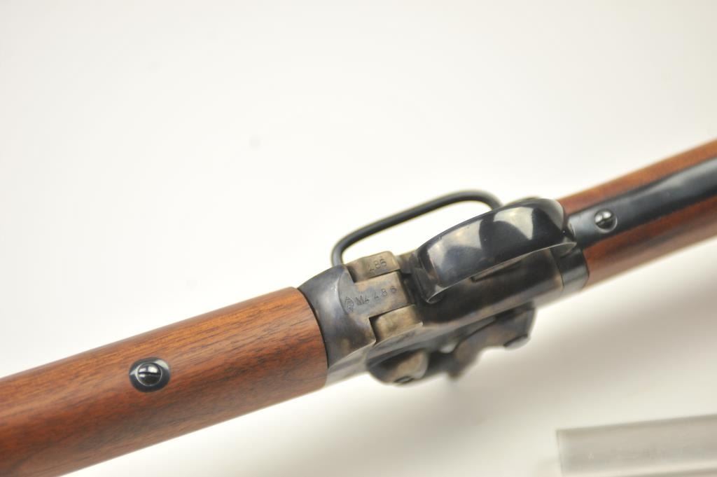 Pietta Reproduction Smith percussion saddle ring carbine, .50 caliber, Serial #M4486. The carbine is in nearly excellent overall condition with a 21 ½” octagon to round barrel. The barrel retains nearly all of the blue finish with a blade front and ladder style rear sights. The receiver, hammer and trigger show vivid case coloring. The smooth wood stock is in excellent condition showing little to no use. Est.: $300-$600.