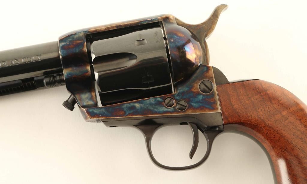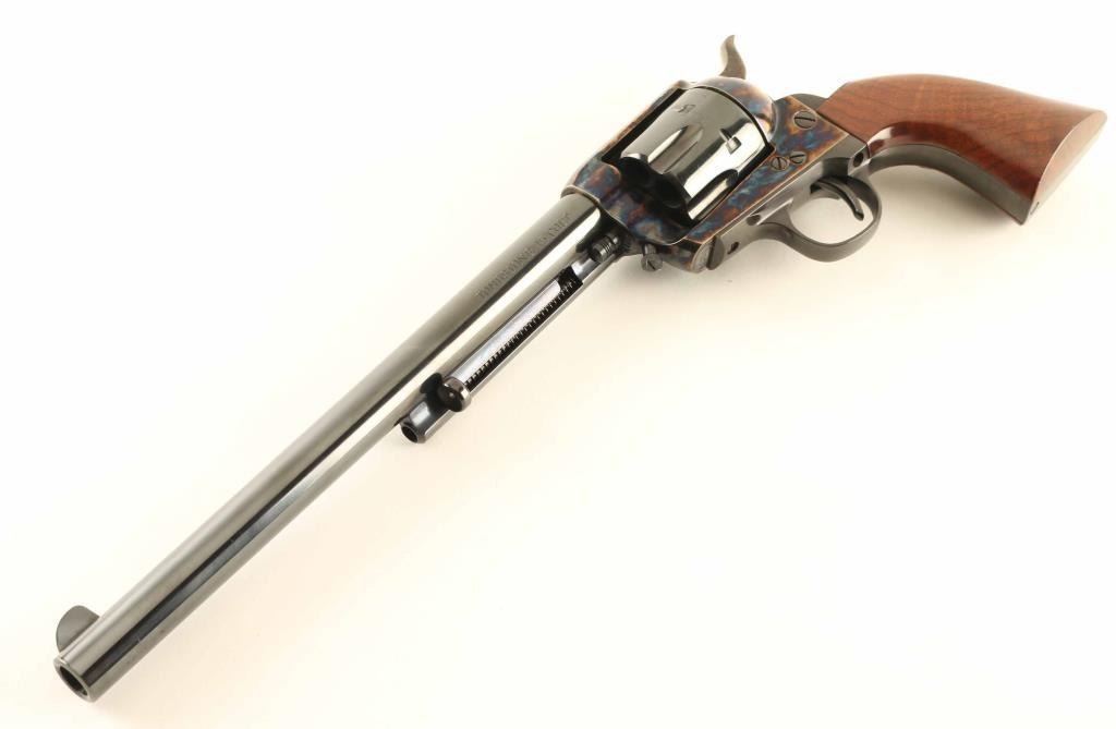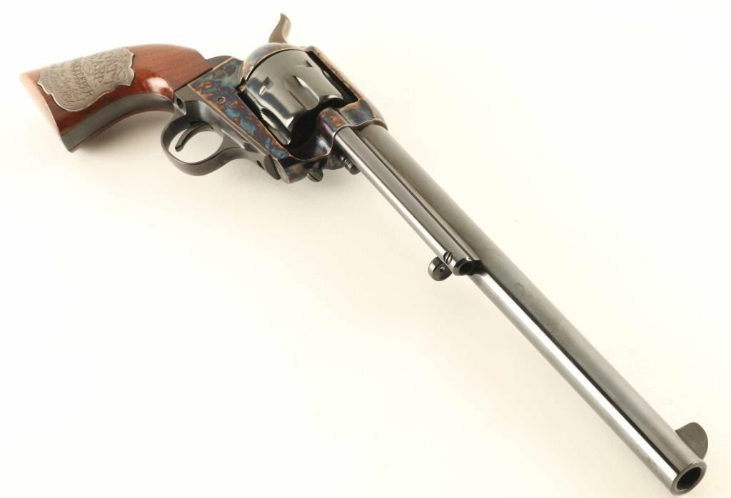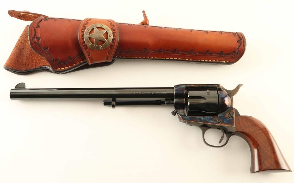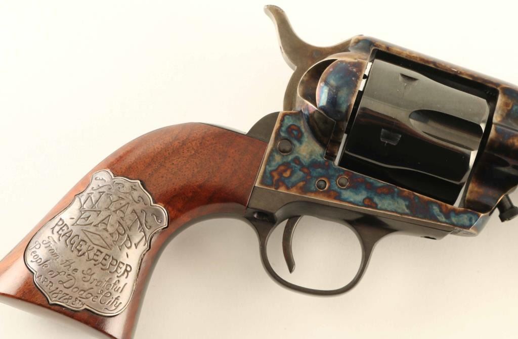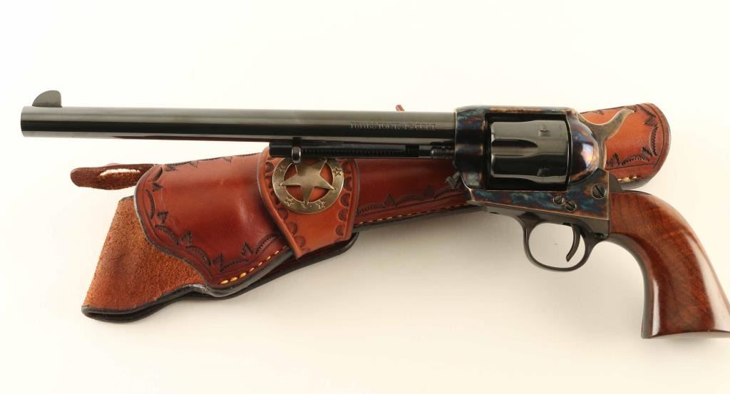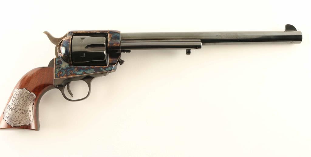 'Wyatt Earp Frontier Buntline' Italian made replica of a 1873 Colt revolver, imported by Cimarron Firearms, Fredericksburg TX. Features blued finish, case color receiver & hammer, 10" barrel, fixed sights, wood grips with decorative shield on right side. Shield is engraved "Wyatt Earp / PEACEKEEPER / From the Grateful People of Dodge City / Apr 8th 1878". Overall condition is like new with few signs of use and handling. Includes very good condition leather "slim jim" style holster with decorative stamping and adorned with a nickel finish star. Condition is NRA Excellent - like new *** Modern Firearm ***