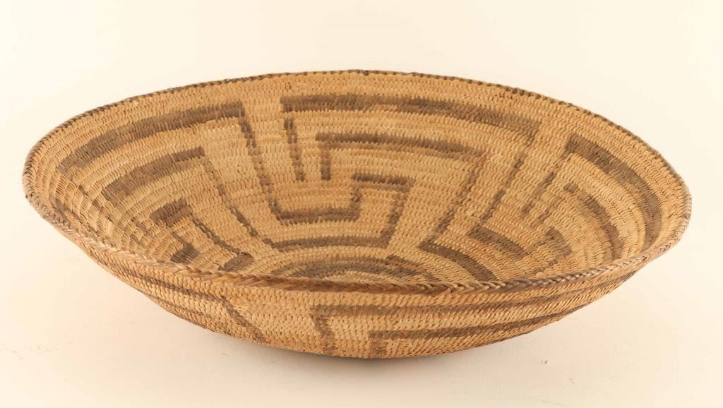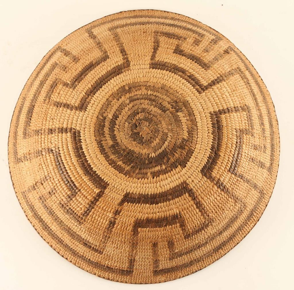 Geometric design and measures 13" in diameter. Shows some minor fading and small scattered losses.