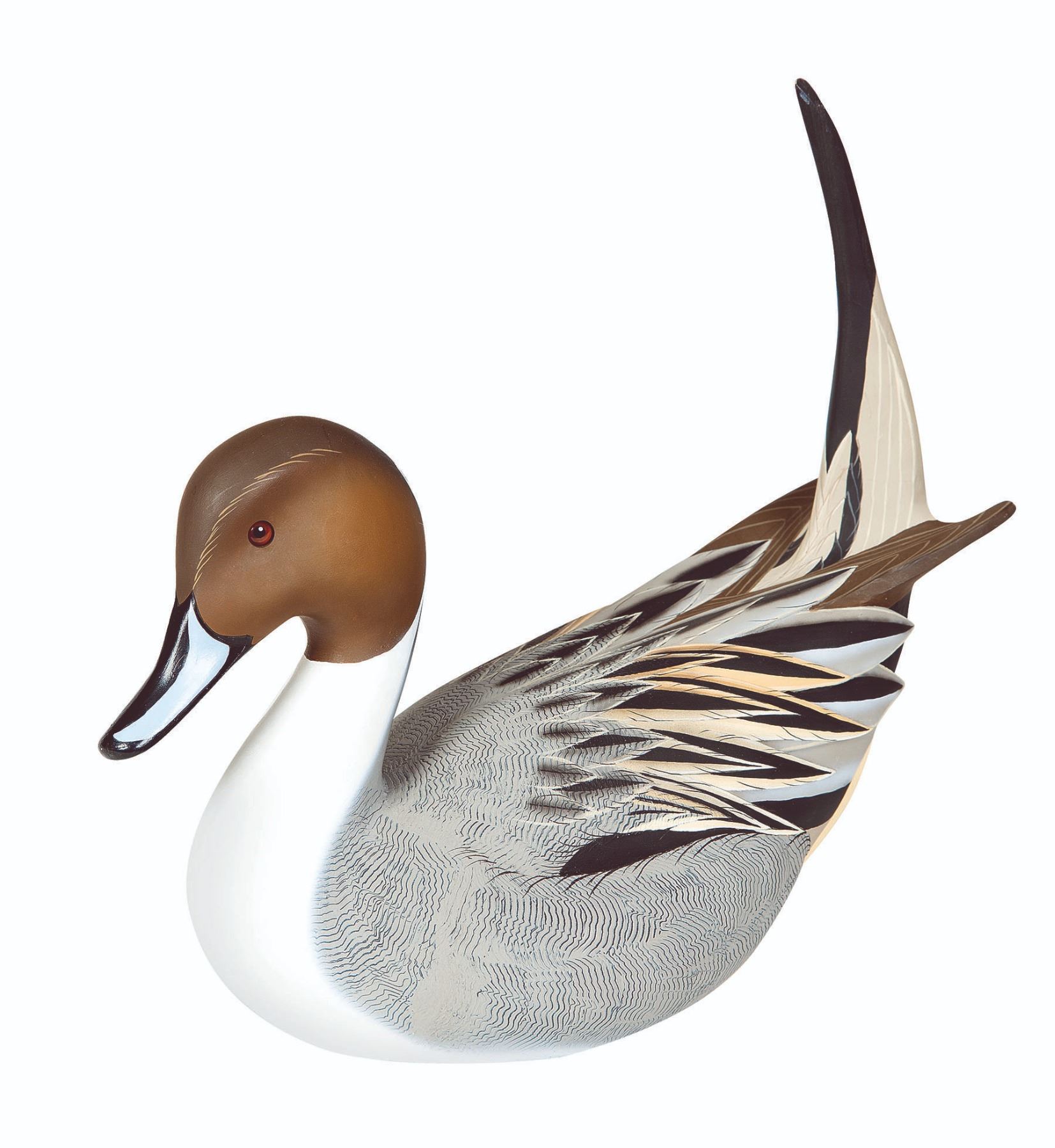 This cast resin pintail drake decoy was created by 4-time World Champion, Randy Tull. The decoy is in a displaying stance. A Ducks Unlimited medallion is inlaid in the felt covered bottom. The decoy measures 12.5” x 6” x 12.5”.