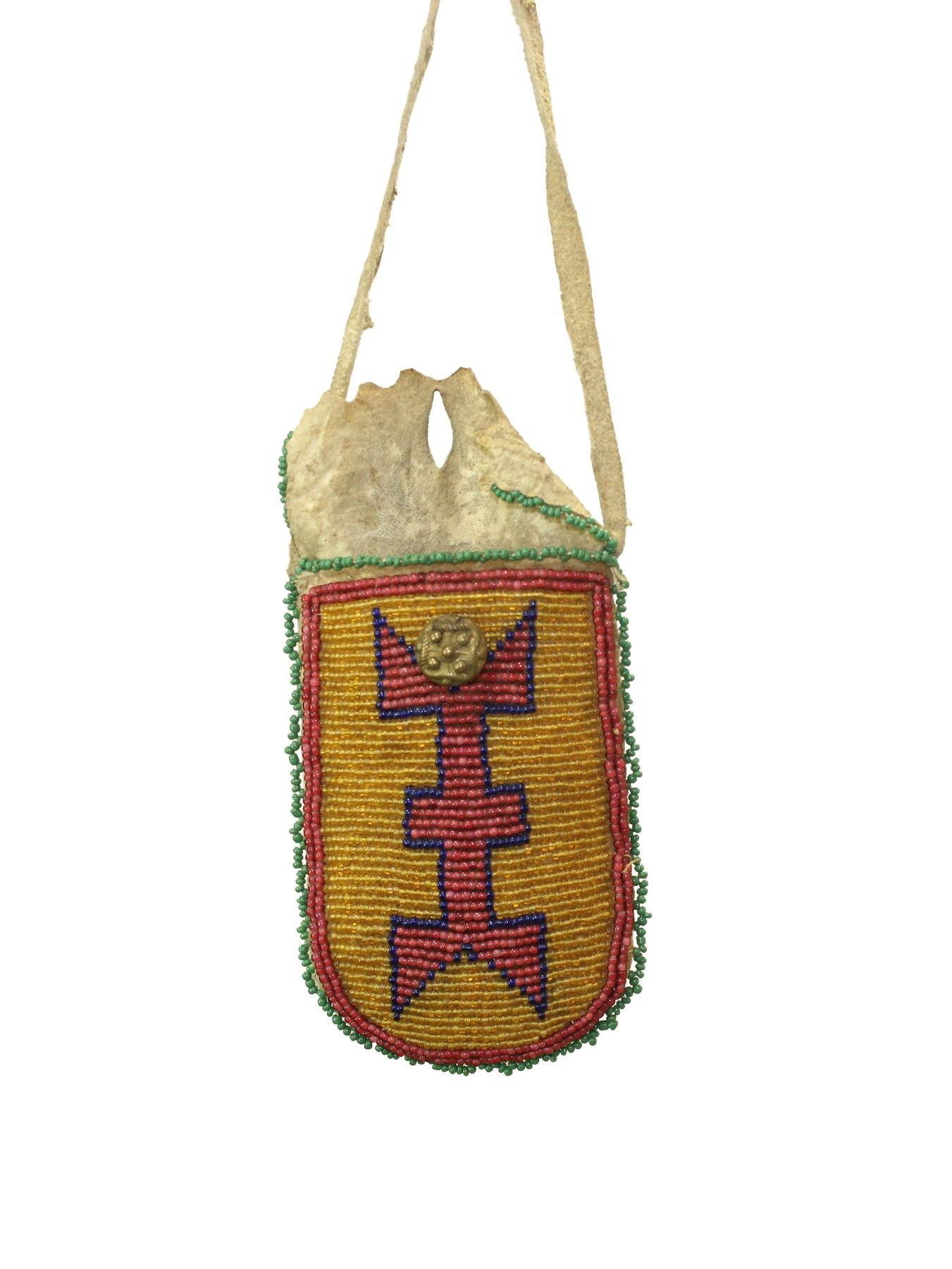 Extra nice full coverage beaded bag with unusual ochre colored background, and finished with a decorative brass button. Measures 4 1/2" long.