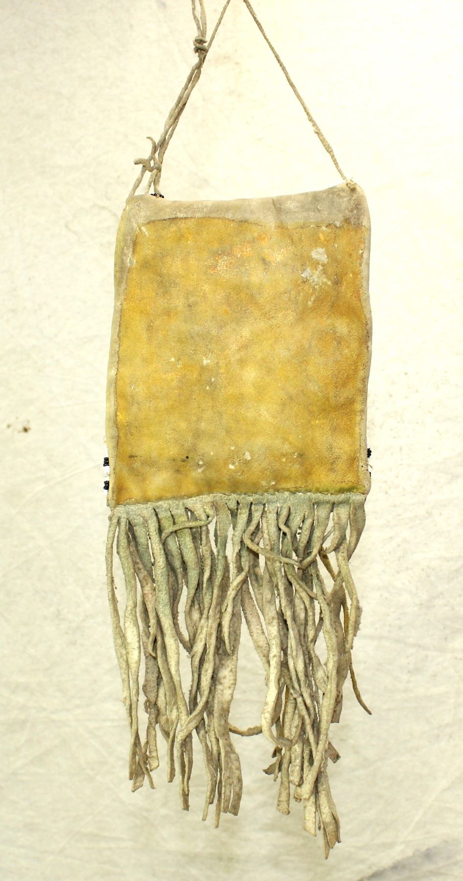 A good looking Northern Plains hide bag with great yellow ochre, interesting beadwork and long fringe. Measures 11"x 4 1/2".