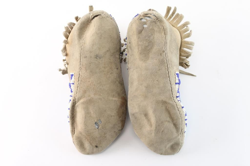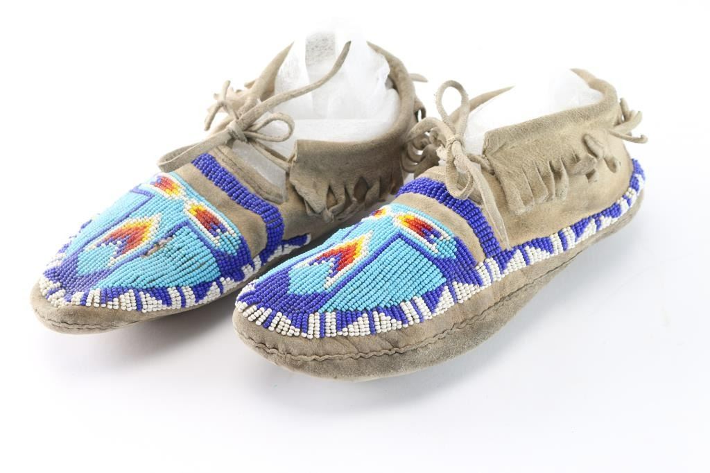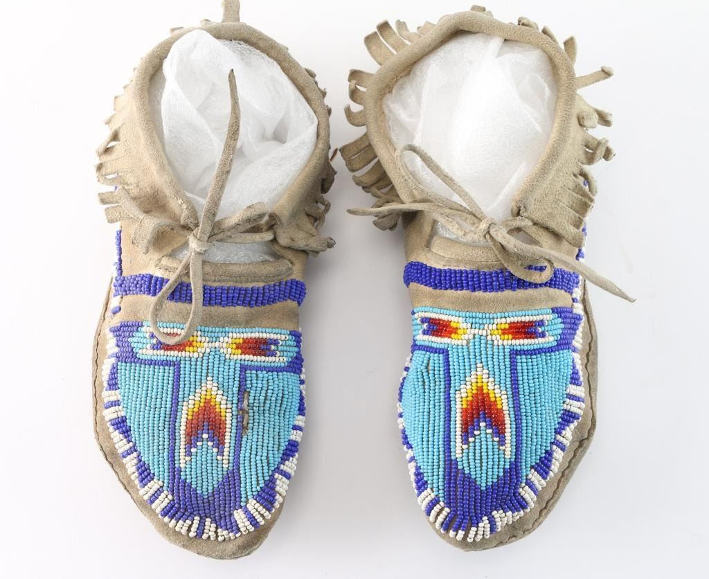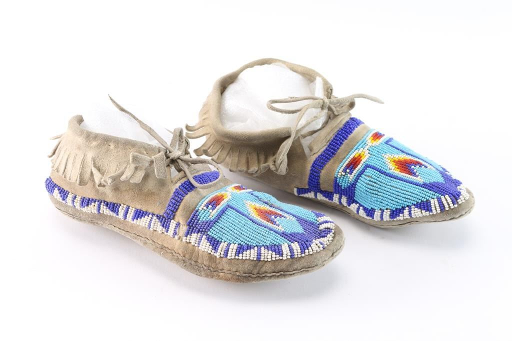 Pair of women's moccasins with light blue, dark blue, red, yellow, and white beading on the toes.
