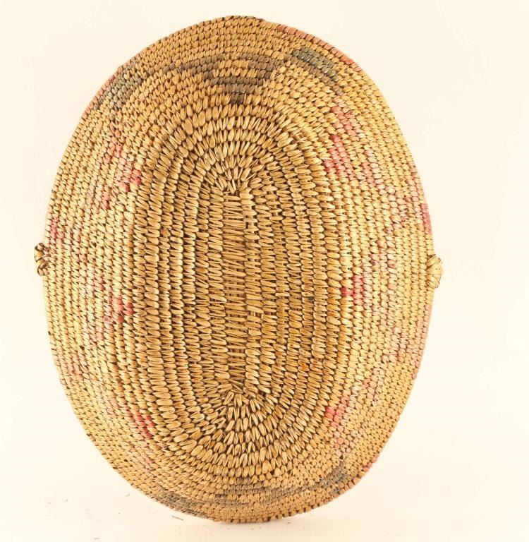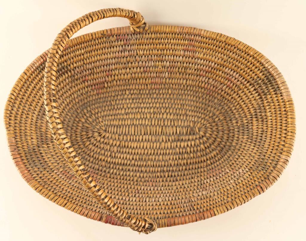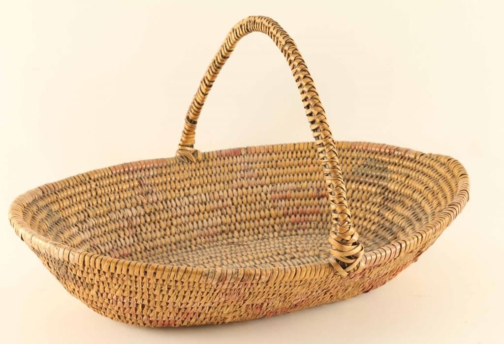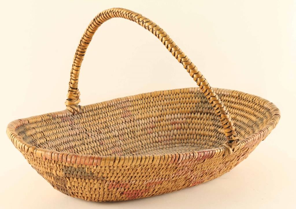 with colorful geometric design which has since faded. Measures 15 1/4" x 9". Handle is loose, otherwise in good condition.