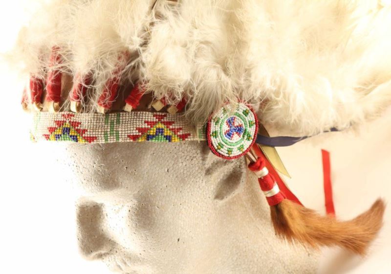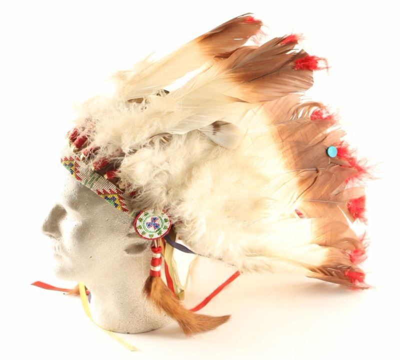 Colorful beaded band with turkey feathers and red marabou feathers. From the Larry Howard Estate.