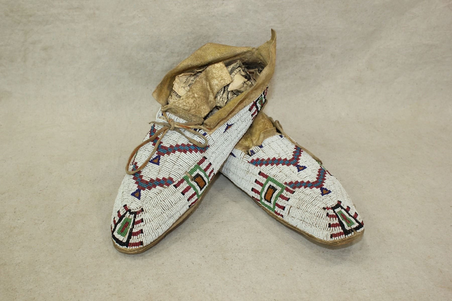 A large pair beautifully beaded sioux moccasins on brain tanned hide, with unique toe pattern on white background.