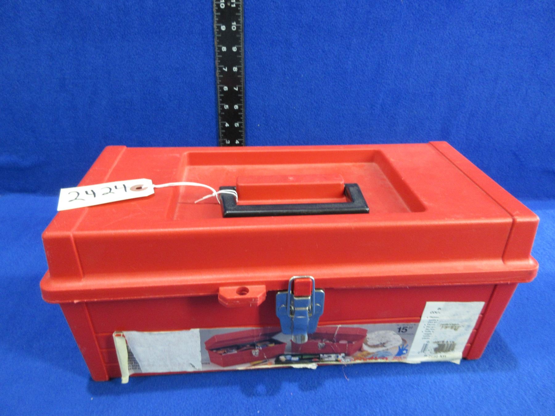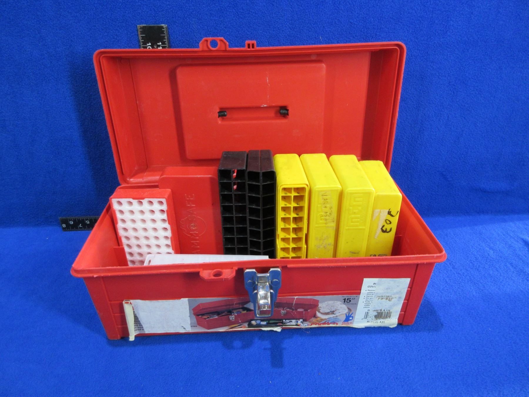 Plastic Tackle Box with Ammo Boxes and Reloading Trays - Tackle box top tray is missing and box is 15" x 7 1/2" x 6 1/2" high
