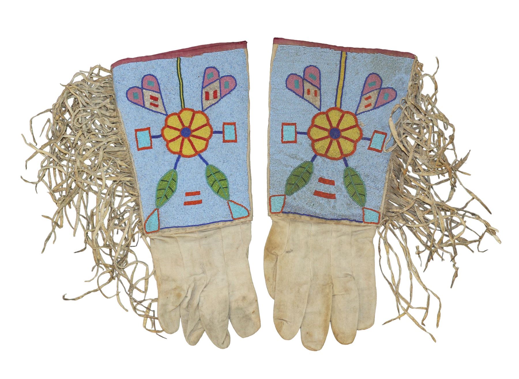 Eye catching gauntlets with oversized cuffs with beautifully floral beaded design on light blue background, and completed by thick fringe.