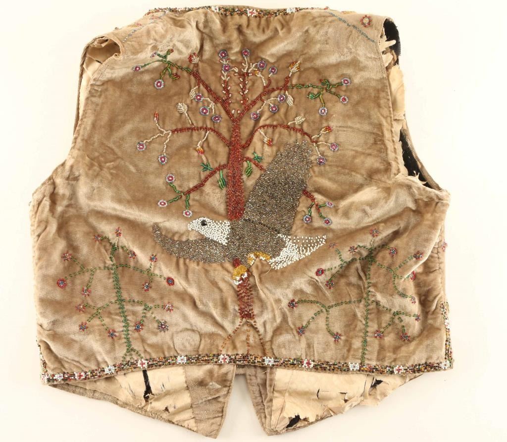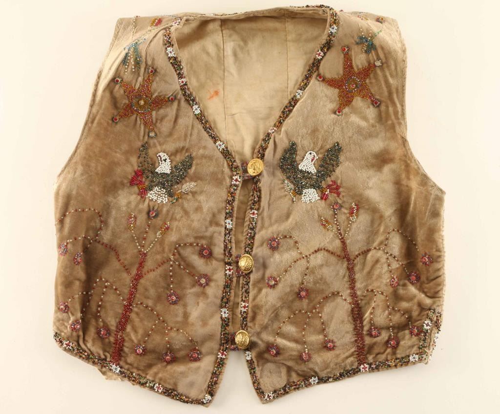 Taupe Velvet vest with colorful beaded eagles, stars, trees and large tree of life with eagle on back very small , shows age circa 1920's era, has brass eagle US military buttons. In overall good conditions some minor fabric issues on the inside and shows some age.