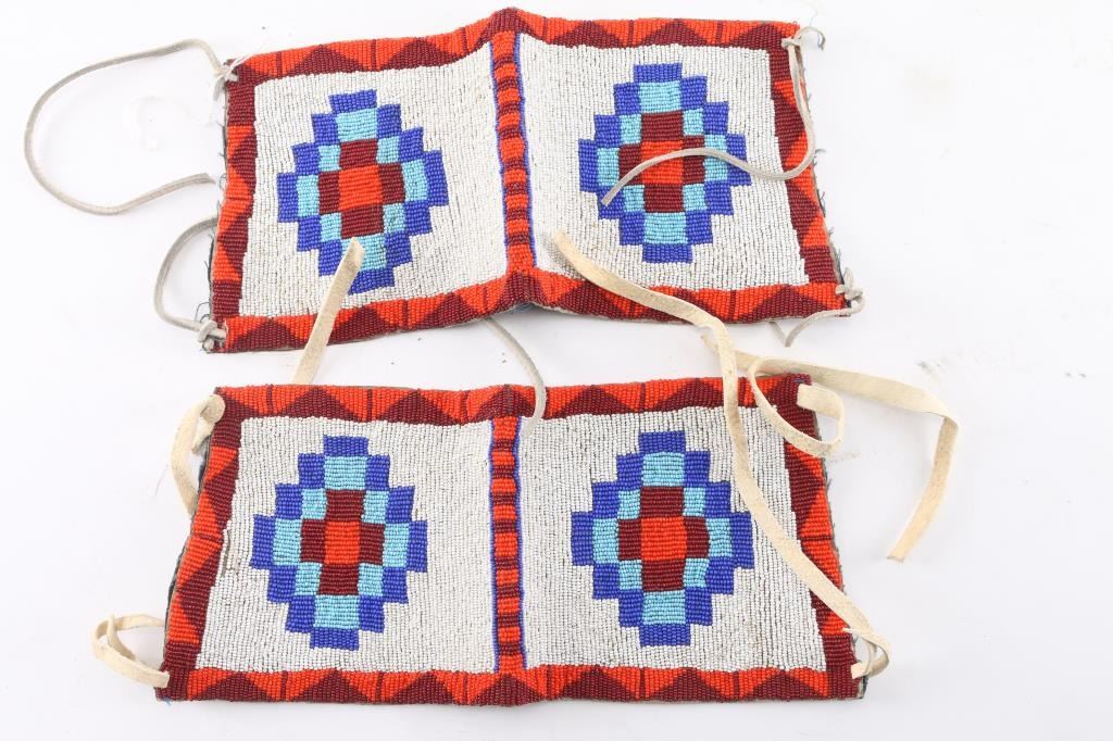 Fully beaded cuffs with orange, red, blue, and white beads on fabric.