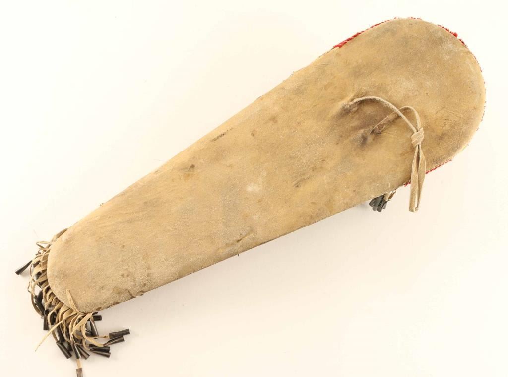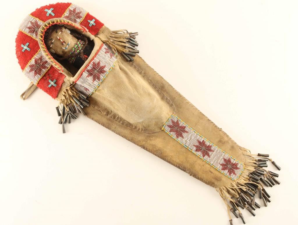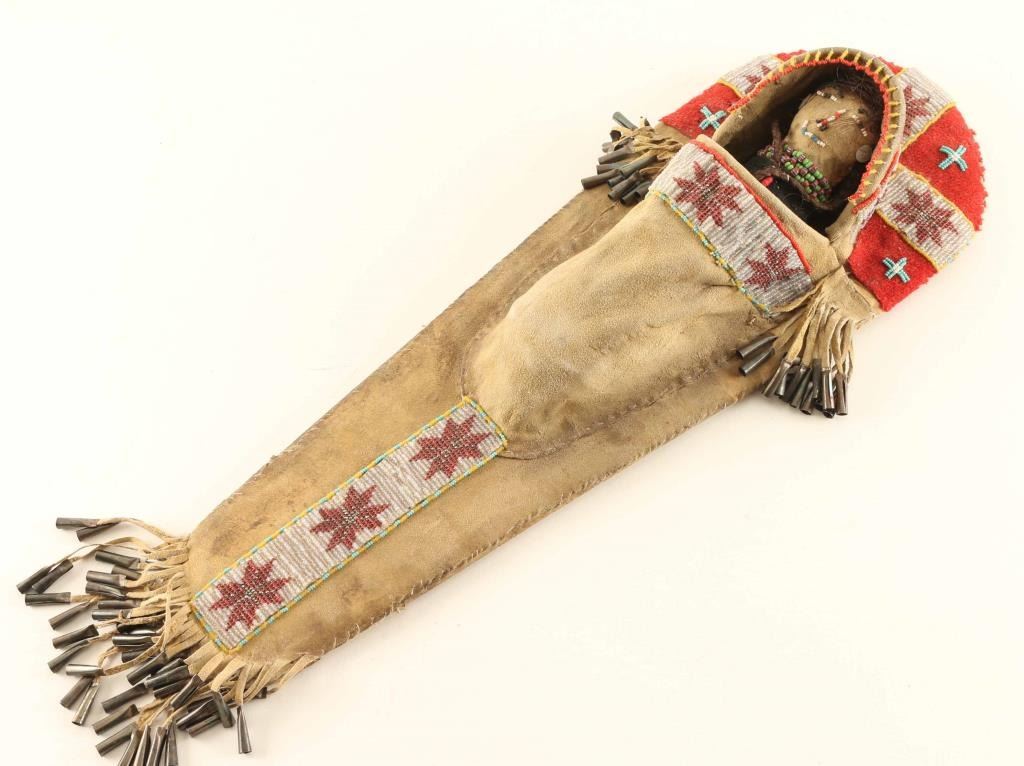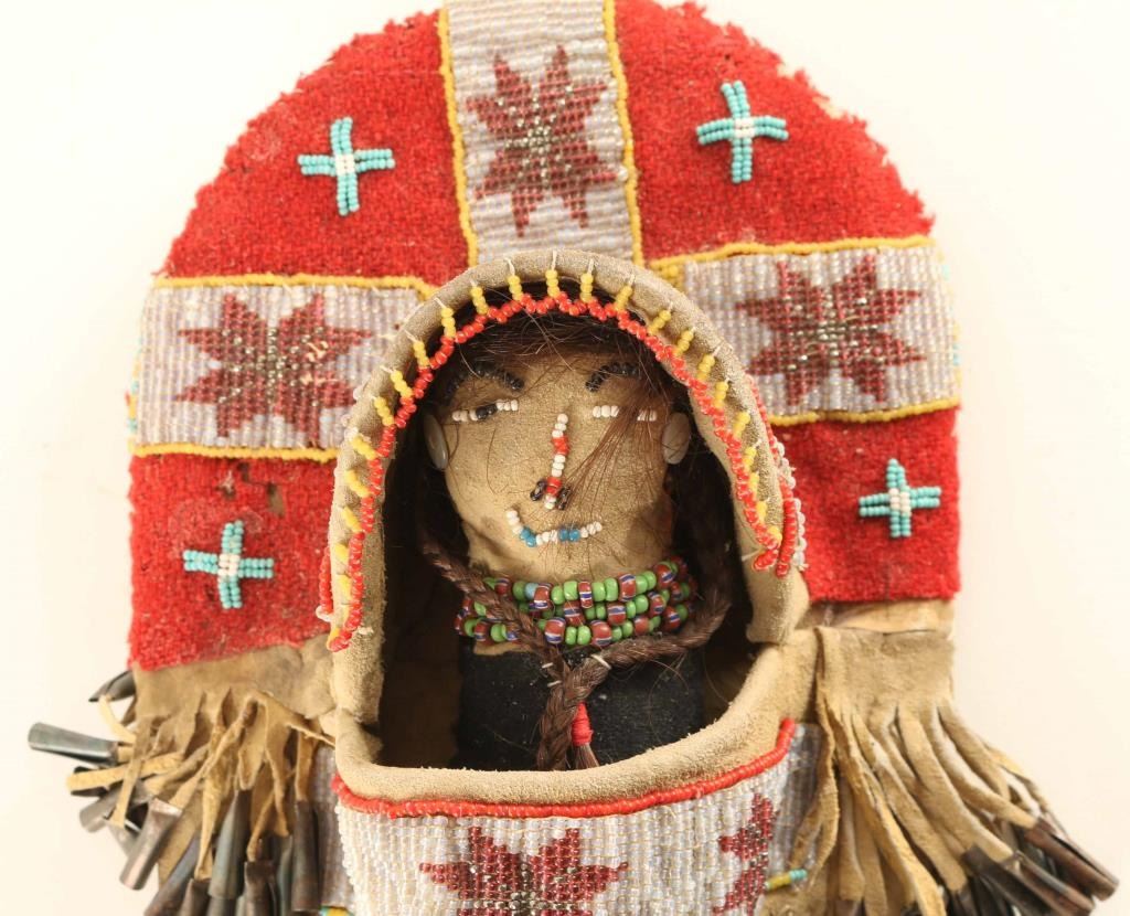 Beautiful leather covered cradle board with cross and floral beaded motif with jingles, the doll is handmade with beaded eyes and braided human hair. Measures 18" overall, excellent condition, circa 1910-1920's.