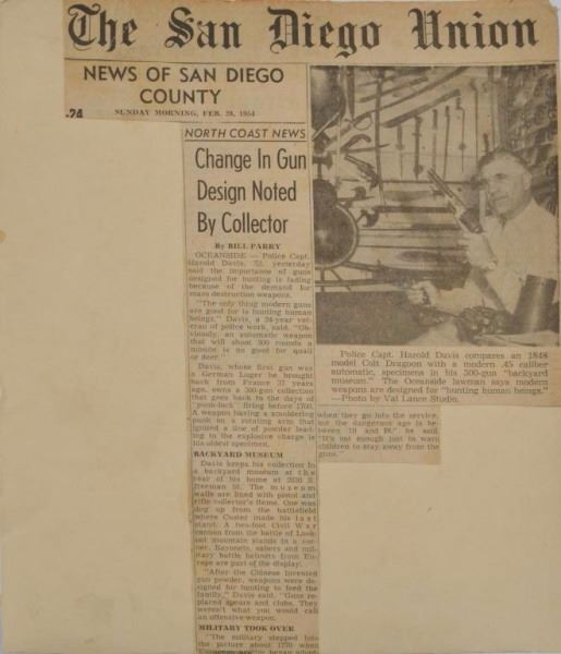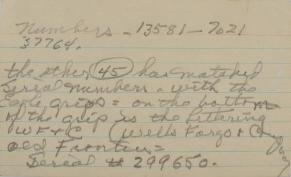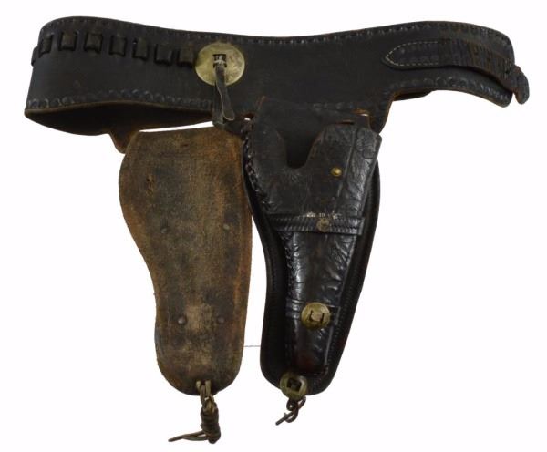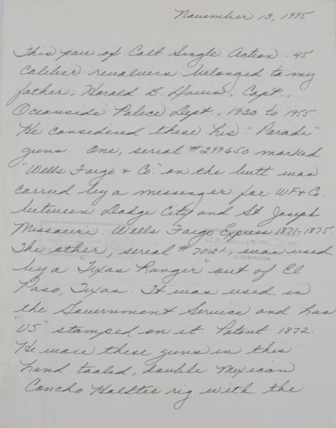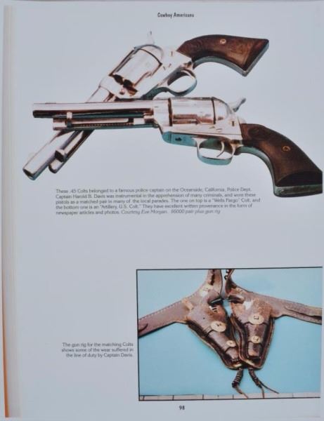 * Belonged to Captain Davis of Oceanside Police Department, California. Comes with tooled belt rig and holsters. SN's 299650 & 7021. featured in the book "Cowboy Americana" on page 98. Colt Artillery models one marked Wells Fargo, One was carried by a Texas Ranger. They each had a life prior, but were worn as a matched pair by Captain H.B. Davis in many local parades.