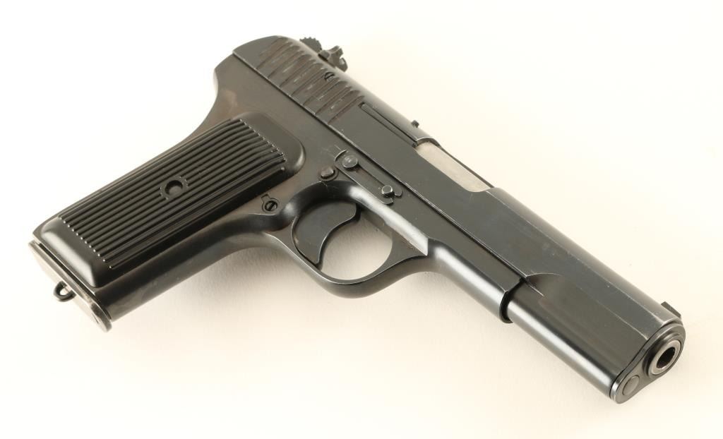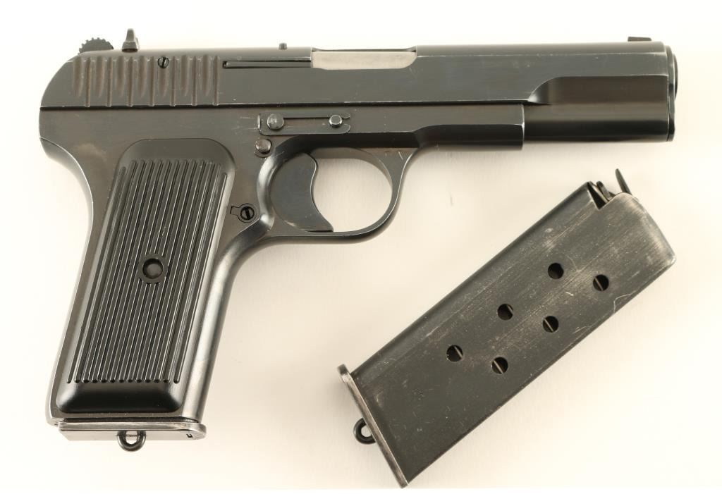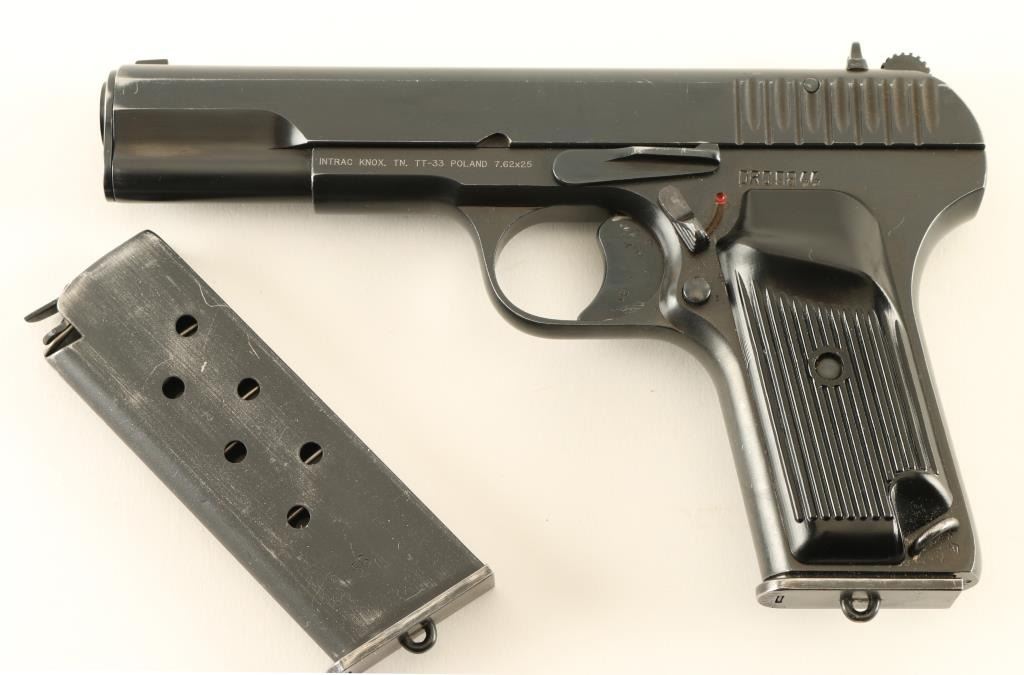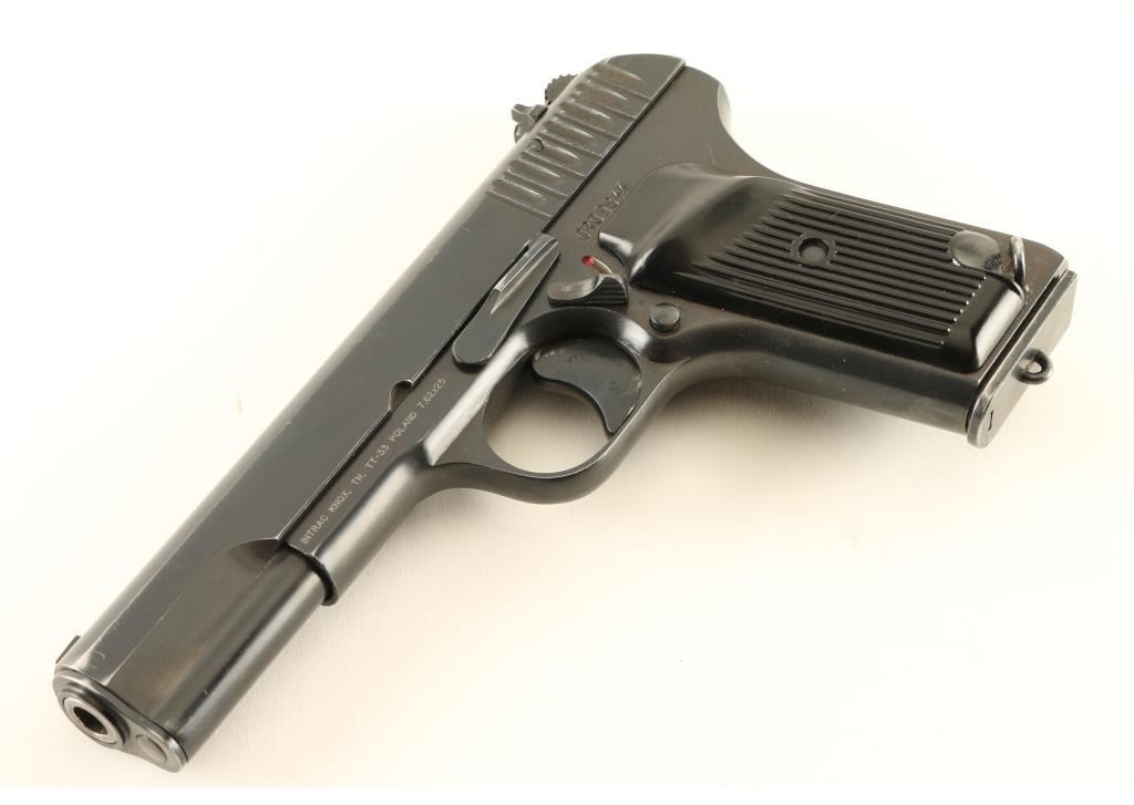 Pistol, Semi-automatic. Single-action. 8+1 capacity. Polish version of the Russian TT-33. 1954 dated. Manufactured at the Radom factory. 11 in a circle on top of the slide. A frame mounted thumb safety has been added to make these pistols legal to import. Short recoil actuated. locked breech single action. 7.6" overall, with a 4.6" barrel. Front blade, rear notch , fixed sights. lanyard ring. Imported by Intrac, Tn. and marked on the left frame. matching serial numbers. Blued metal finish, with black,plastic, lined grips. Comes with two 8-rd magazines, with lanyard rings. Slide action is smooth/tight. Bore appears excellent. bright. Grips are excellent. Blued metal finish is about 98%, with some minor edge wear, and a few minor scratches/rubs. NRA Condition-Near Excellent. Modern firearm. C&R Eligible.
