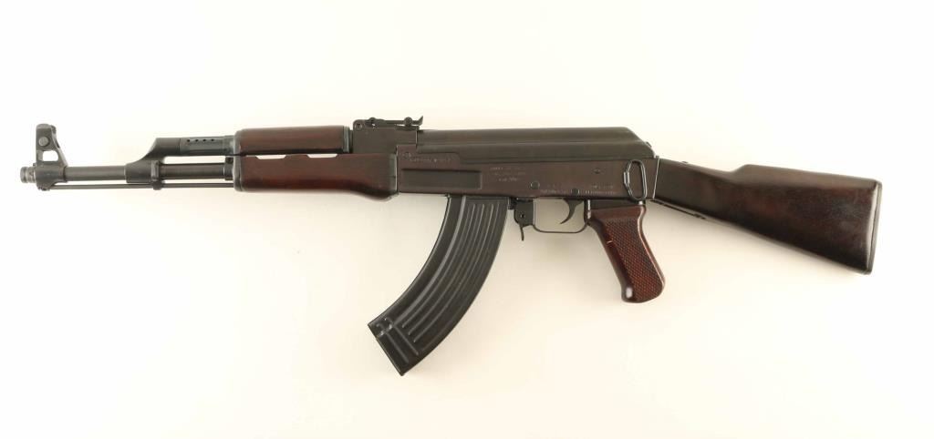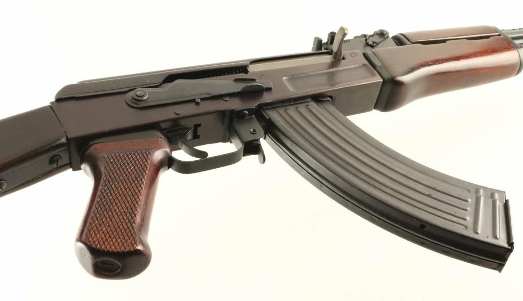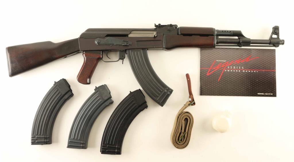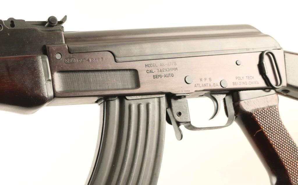 'Legend' Chinese semiautomatic rifle imported by KFS Atlanta GA. Features milled receiver, blued finish, dark color wood furniture, hard chromed bolt & carrier, 16" chrome lined barrel, adjustable sights with protected post front & tangent rear, cleaning rod under barrel, cleaning kit in butt trap, muzzle cap over threads, forward sling slot, rear sling swivel, manual safety. Bore is excellent. Overall condition is close to new, with few signs of handling, visible scratch to pistol grip. Marked with "386" in oval. Numbers on bolt & carrier match receiver. Includes (4) total blued steel flat back 30 rd magazines, olive green canvas web AK sling (appears Chinese, with leather end tab), white plastic oil bottle, factory manual. Condition is NRA Excellent - like new *** Modern Firearm ***