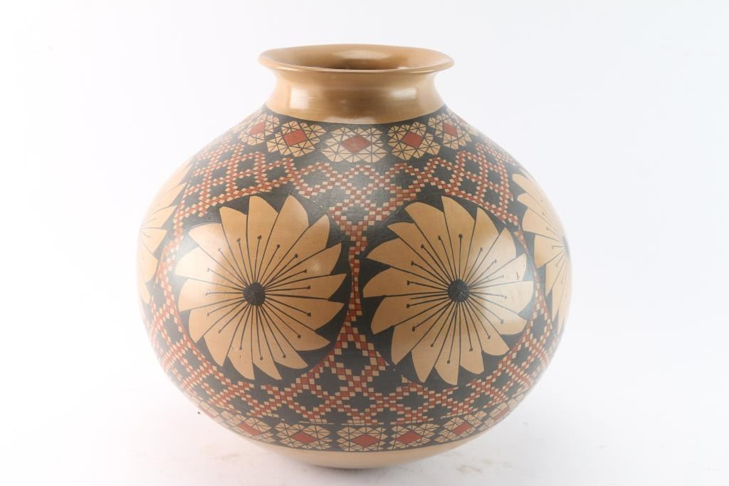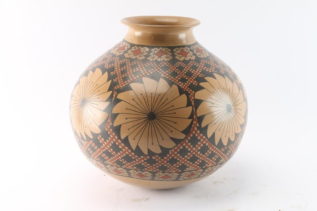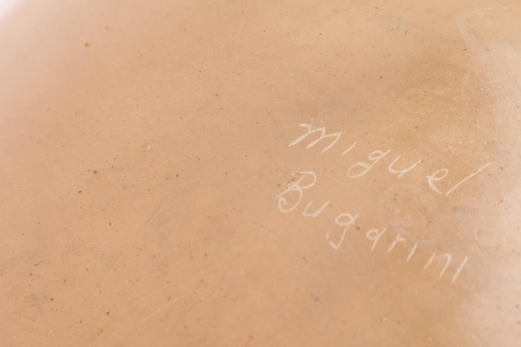 Large polychrome jar, signed Miguel Bugarini. Measures: 11" x 12"
