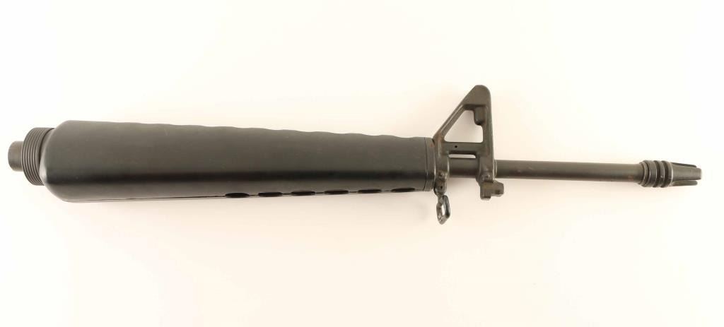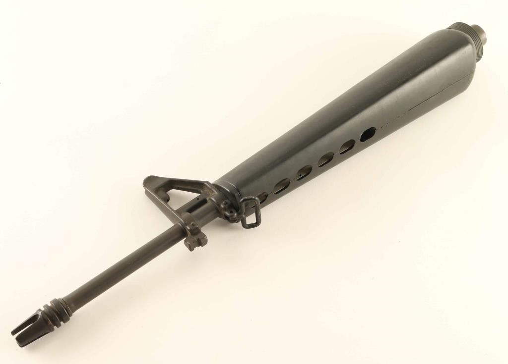 20" barrel with three prong flash hider, front sight base with bayonet lug & A1 post sight, triangular handguard and barrel nut. Observed marking: "MP", "S" & "12". The bore is good and the outer metal surfaces show light scattered spots of rust.