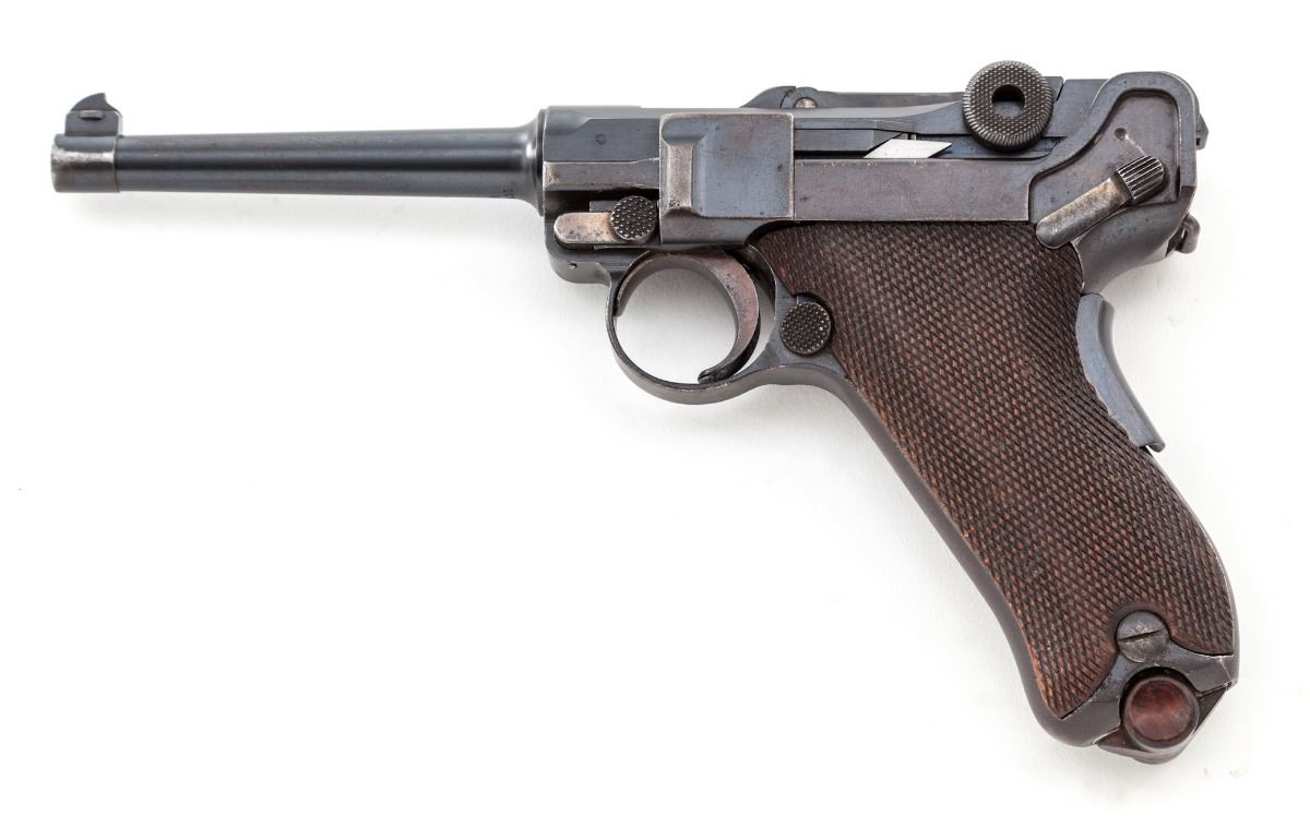 Portuguese Contract Model 1906 Luger, by DWM, #2433, .30 Luger cal., 5'' barrel, blue finish, checkered walnut grips, with serial number and Portugese acceptance marks on barrel, acceptance mark on left side of barrel extension, and ''(crown)/M2'' for Manuel II on chamber. Sights are fixed combat type. Magazine is a tin-plated unnumbered wood base example with Portugese acceptance mark. Condition is excellent retaining approx. 90% original factory rust blue with about 30% turning to a fine brown color; straw colors are turning dark brown. All visible matching numbers, except unnumbered firing pin. Unnumbered grips are excellent with slight flattening to the checkers. Action is tight, bore is strong with frosting in the grooves. Est.: $1,200-$1,800. (C&R)