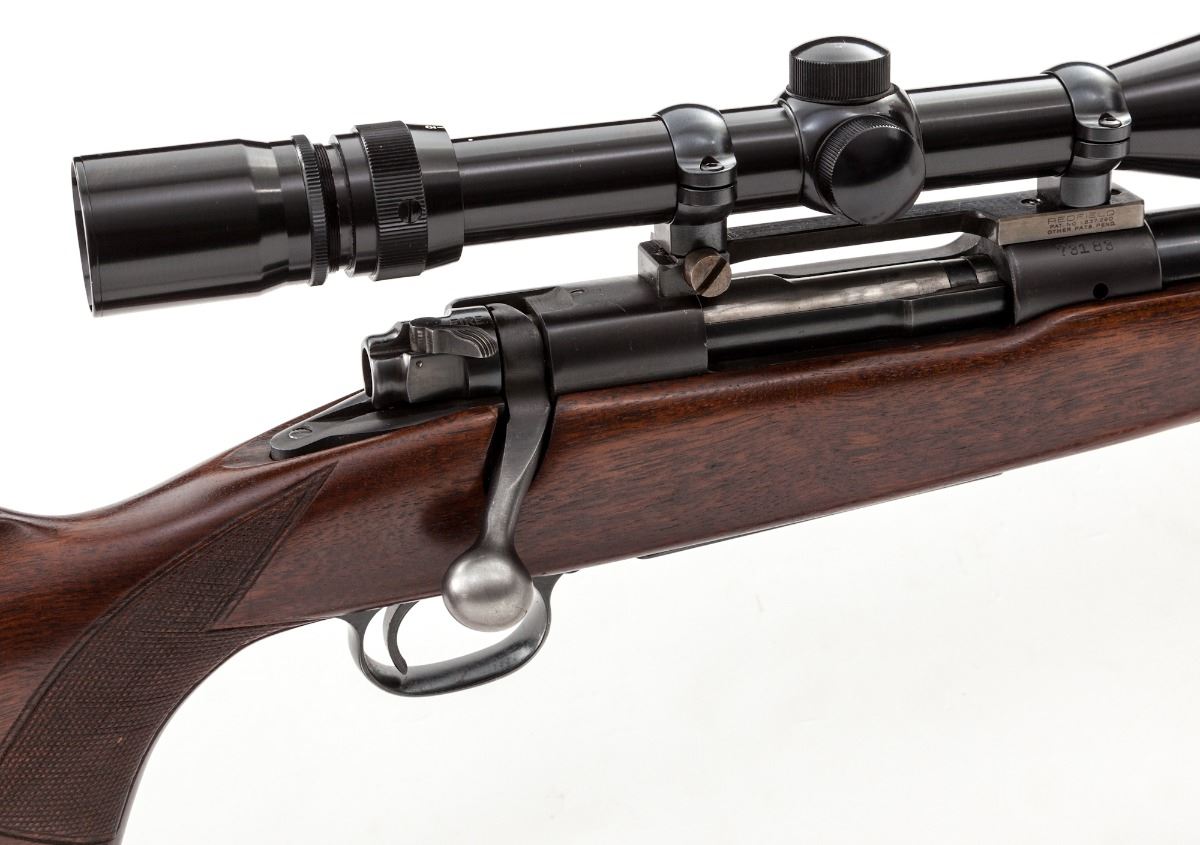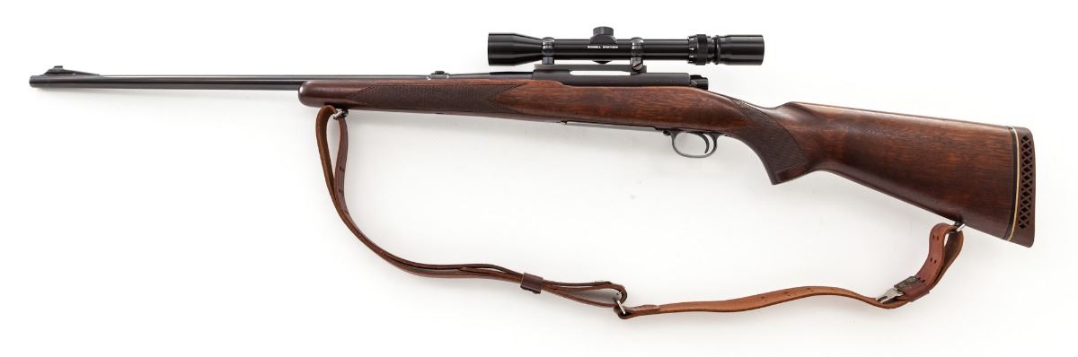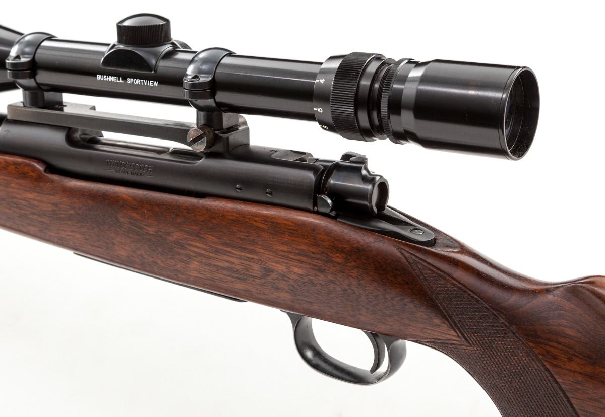 Post-War Winchester Model 70 Bolt Action Rifle, #73183, .257 Robts. cal., 24'' barrel, blue finish, checkered walnut stock, brown rubber butt pad. Topped with a Bushnell Sportview 3-9x scope on one-piece Redfield rings and mounts. Mfg'd 1947, with transitional doll's head tang. Condition is near excellent retaining approx. 94% blue. Stock may be from another rifle, as it has a clearance cut along the top left edge for a tip-up scope. Receiver shows no additional holes drilled. Stock shows light impressions from field use and very minor flattening to checks. Action is good, bore is fine, scope optics are clear. Scarce in .257 Robts. Est.: $1,800-$2,400. (C&R)