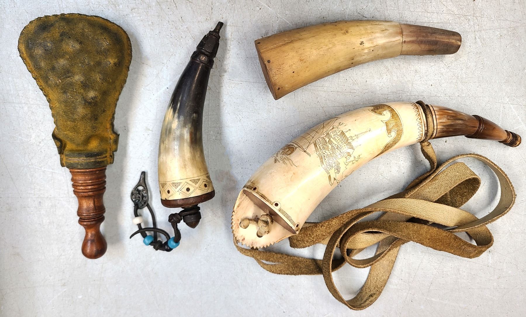 Powder Horn & Shot Pouch Lot - Real Horn - One Engraved