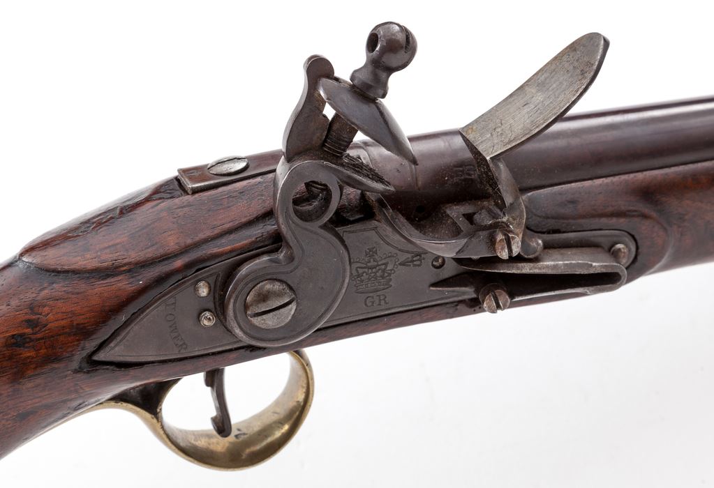 Matched Pair of Late 18th Century British Pattern 1756/77 Long Sea Service Flintlock Pistols, NVSN, .57 smoothbore cal., 12'' round barrels with turned rings and two deeply struck proofmarks at breech, no sights; steel lockplates pointed at the rear with ''(large crown)/GR'' and ''(broad arrow)'' ahead of cock and ''Tower'' in a vertical curve behind; brass furniture including serpentine sideplates opposite locks, triggerguards having crown-like front finials, buttcaps and single ramrod thimbles. Walnut fullstocks with raised oval aprons surrounding barrel tangs, raised carved finials at rear of lockplates and to rear of sideplates; one with ''I G'' and ''(crown)/P'' stamped in the wood behind sideplate and ''(broad arrow)/B O (faint)'' on tang apron, the other with ''P R'' and ''(crown)/P'' behind sideplate and possibly ''(broad arrow)/B O'' on tang apron, now nearly obliterated. Stocks have additional ''(broad arrow)'' stampings in various locations. Both pistols have long iron belt hooks with ''(crown)/P'' proofmarks, mounted to their sideplates. Pistols appear to be in original flintlock configuration, their touchhole areas having been polished when barrels were re-browned. Condition to both is very good to fine for their age and type, the barrels having been cleaned and re-browned at one point, the iron surfaces otherwise having a smooth brown patina; brass parts are bright. Screw head slots are straight and unmarred; one frizzen spring may be a replacement; brass-tipped hardwood ramrods may be original. Stocks are sound and fine with clear markings, moderate age dings from their period of service, pleasing color and a coat of later varnish. The action of one pistol is smooth and tight; the other does not hold at cock; bores appear very good. Large, partitioned walnut case is of modern make, containing a reproduction copper and brass powder flask, reproduction brass single-cavity bullet mold, quantity of cast lead balls, and working key, all in very good condition. The British Royal Navy used these Sea Service Pattern pistols around the world, beginning in the middle-18th Century and extending into the early 19th Century. They saw service during turbulent times within the British Empire, including the French & Indian War, the American Revolution and the War of 1812. Est.: $5,000-$7,500/pair. (Antique)(Joe Poyer collection)