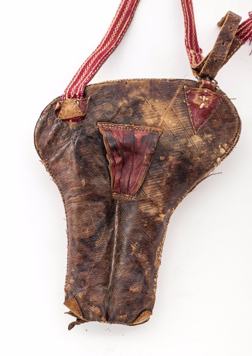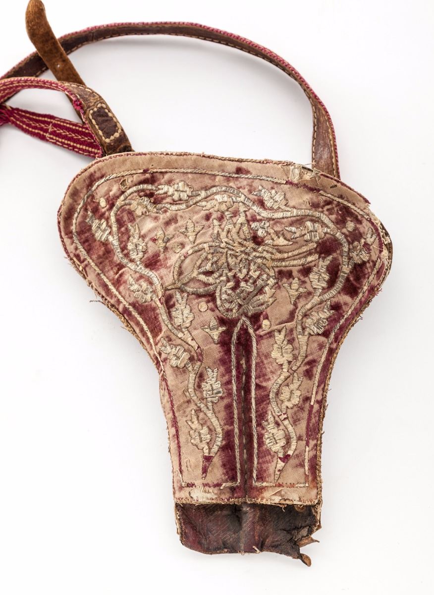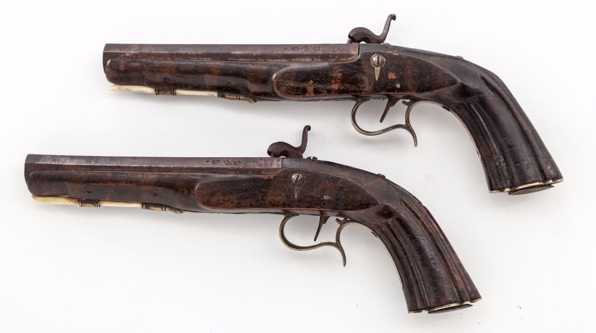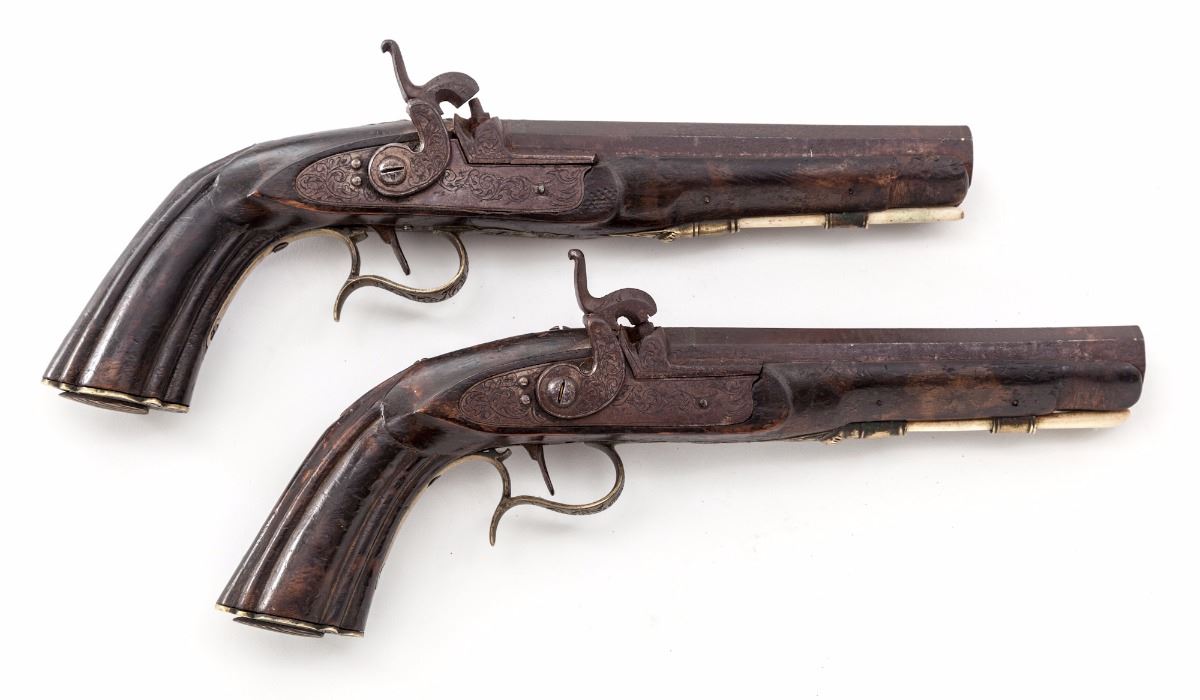Pair of Continental Turkish/Ottoman Single Shot Saddle Holster Pistols, approx. .60 smoothbore, 7-5/16'' barrels, brown finish, reeded European hardwood stocks, with Turkish half moon and star motif on top barrel flats. Possibly Belgian for the Ottoman market. Condition is fair. All steel surfaces have turned a uniform brown with light surface corrosion overall. Pistols are overall decorated with a floral/scroll engraving pattern. Barrels are slightly swamped octagon, possibly Damascus steel, with two script and one cross key proof. The Flobert style reeded stocks are intact with slight losses to the muzzle ends. Brass furniture is floral scroll engraved with shell motif traps in butts. Both are contained in a purple embroidery covered leather holster with shoulder strap. Holster shows its age with general fading and loss to the cloth and stitching. The leather, while still supple, shows several losses around the edges. Pistols are fitted with an unknown type of bone ramrod. Est.: $800-$1,200. (Antique)
