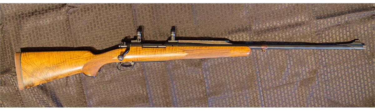 This rifle has a 26" barrel, extensive metal work including a custom quarter rib, folding rear sights, custom barrel band sling attachment and barrel band front sight. Also has removable muzzle break, and custom Oberndorf type bottom metal. Metal work was likely done by Tom Burgess but is not marked.