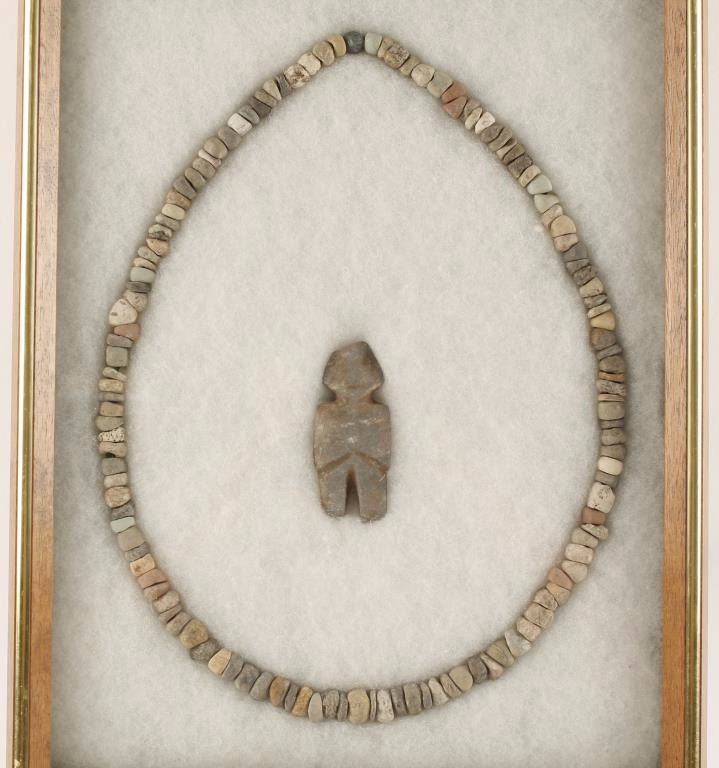 3" figure carved from gray rock is surrounded by necklace with gray, white and pink earth tone beads. Enclosed in case 13 1/2"x17 1/2" with wood frame. Price of figurine alone is quoted at $700.