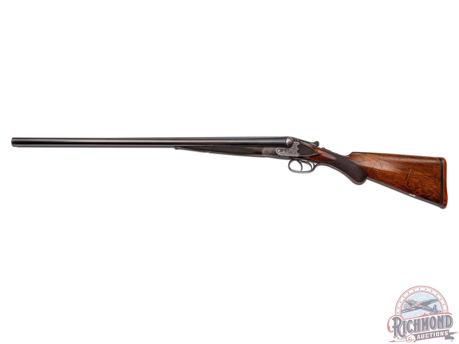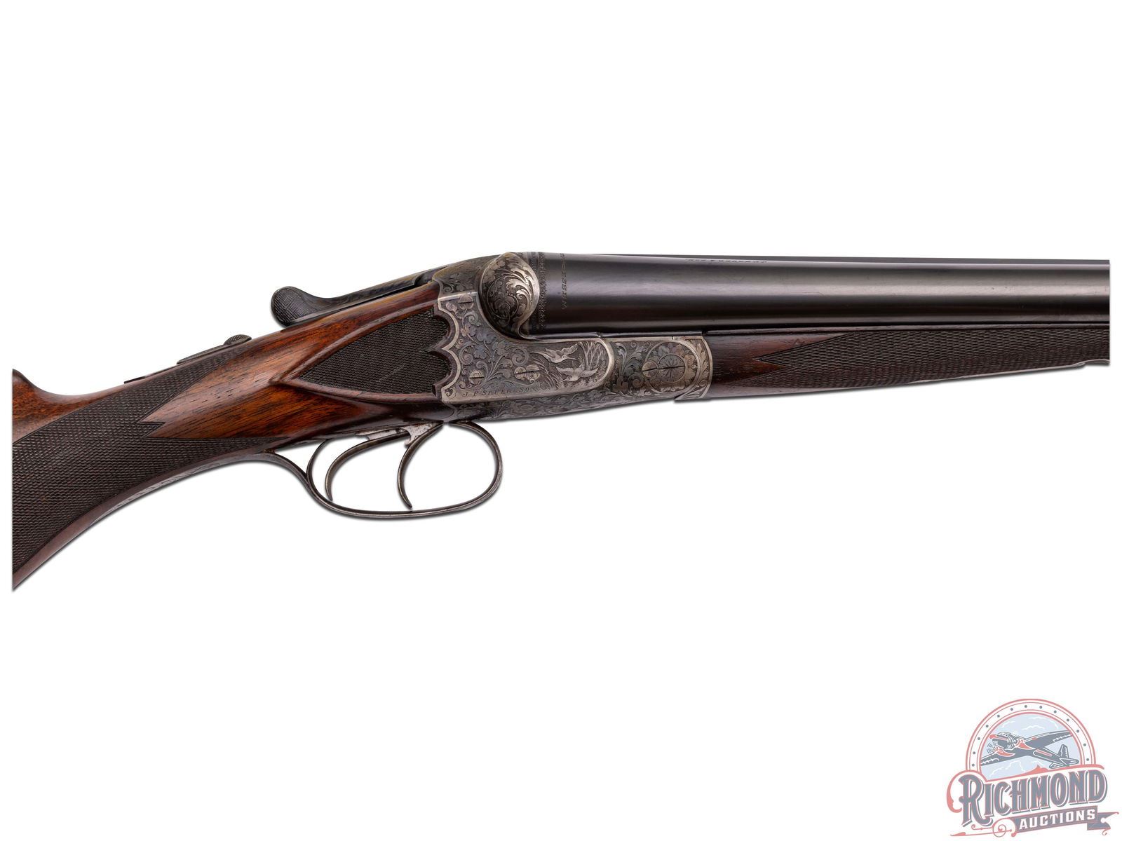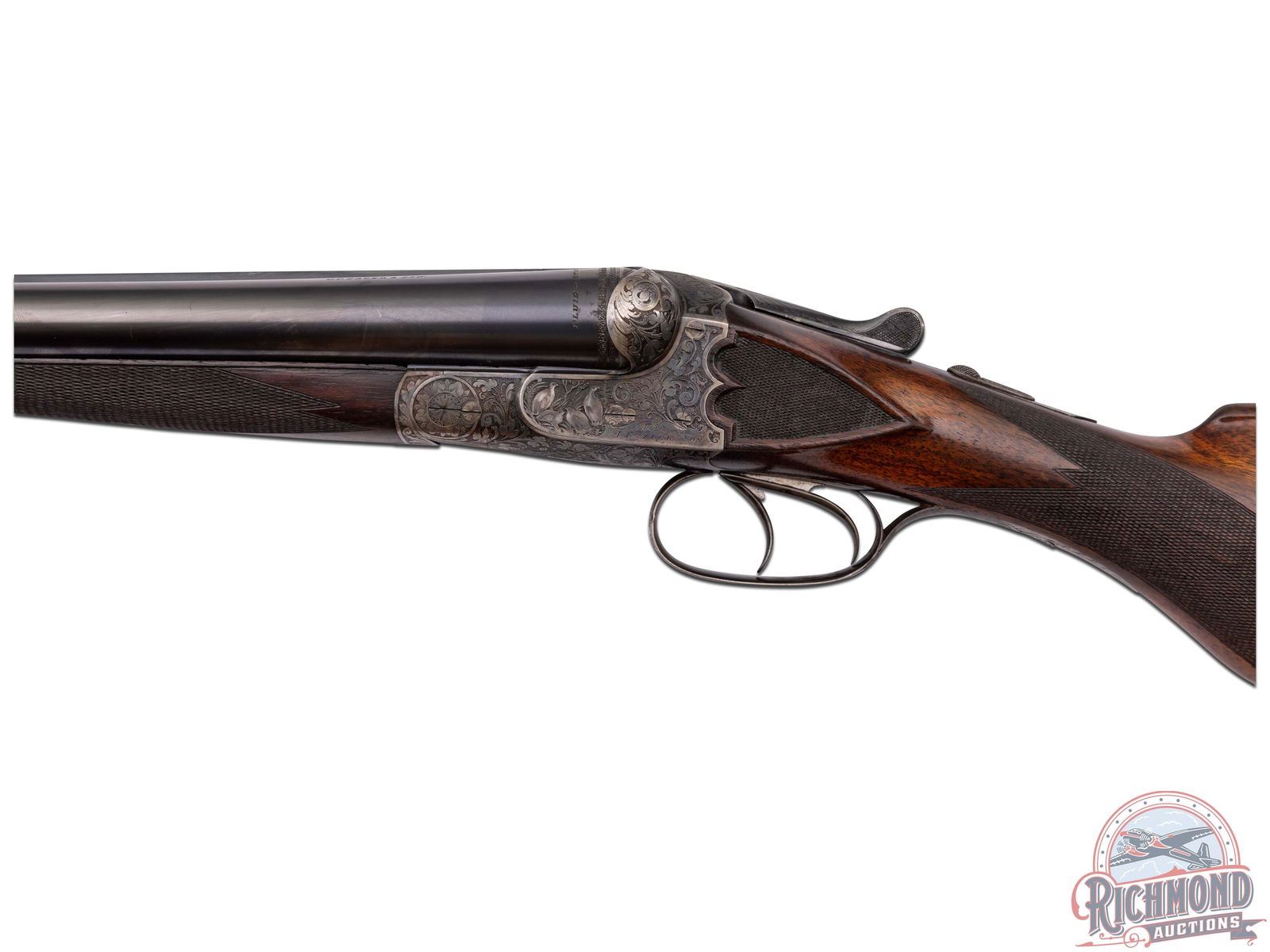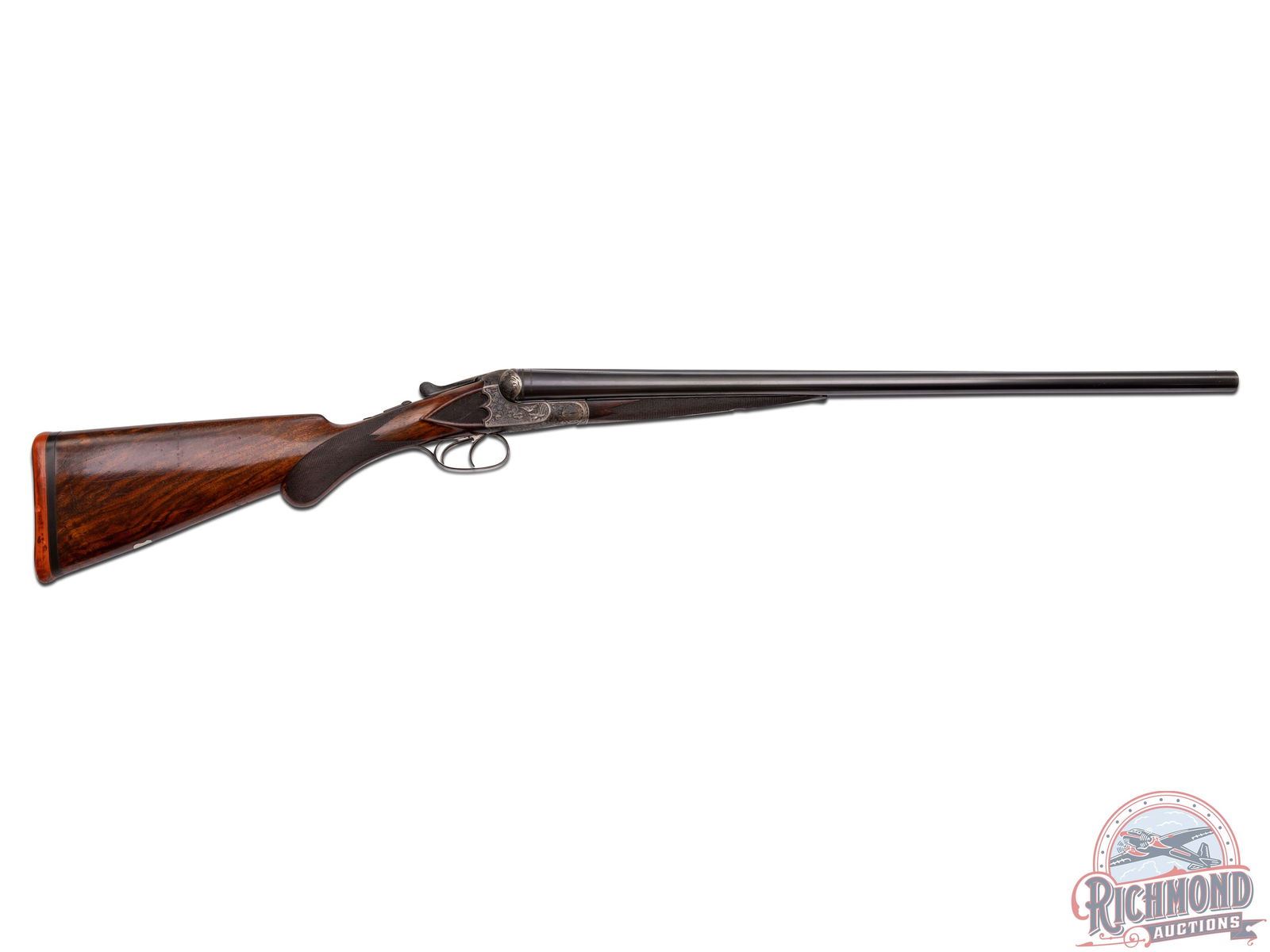 Manufactured circa 1910 in Prussia by J.P. Sauer. No import marks found. Maker marked 26" Krupp Fluid steel barrels with raised matted rib, bead front sight, ejectors, 2-3/4" chambers and choked Full and Modified. Krupp steel marking circling breeches. case-hardened boxlock action with floral and game scene engraved frame with side clips, Greener crossbolt, double triggers and automatic safety. Walnut round knob checkered pistol grip stock with German silver vanity plate and period leather faced recoil pad. Matching walnut checkered splinter forearm with latch release. An unusual and desirable shotgun! LOP: 14-3/4". DAC: 1-1/4". DAH: 2". CALIBER: 12 GA. S/N: 166801. FFL STATUS: Curio & Relic.
