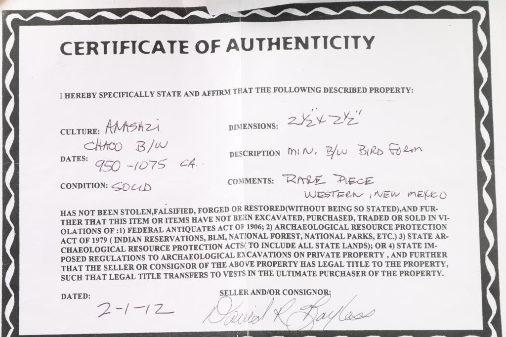 950-105CA, 2.5x2.5, Bird form. Certificate of Authenticity.
