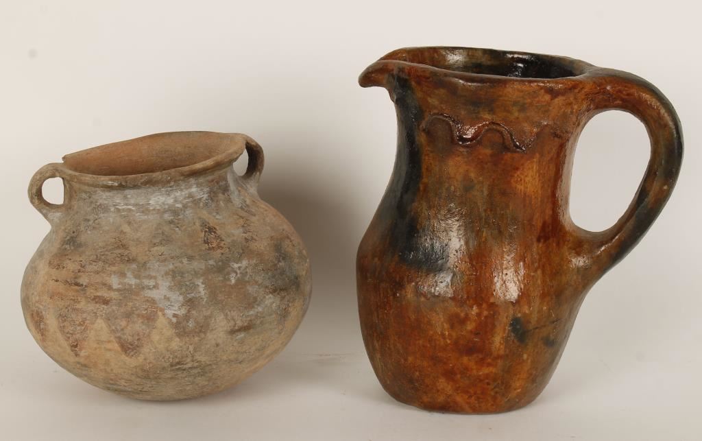 Hohokam Rillito, Red on Brown pottery bowl. This historical ancient artifact was found in the Tucson Basin area archaeological site. This ancient pot is hand coiled and fired, dating back to circa A.D. 850 - 900. it is wonderfully preserved and almost completely intact with a couple of chips on the rim. It has a flared tip with two small lug handles and features a hand painted faded red based slip design of intriguing concentric bands of geometric triangles - Possibly a sun image on the outside, measures 5.5" x 6". Also included in this lot is a Vintage Collectable Navajo Dine Pitcher hand coiled Arizona clay, pit fired and sealed with a thick coating of pitch. This pitcher features the rich terra cotta color with carbon smudge 'fireclouds'. Excellent condition, circa 1940's Native American Art, measures 7.25" x 4.25".