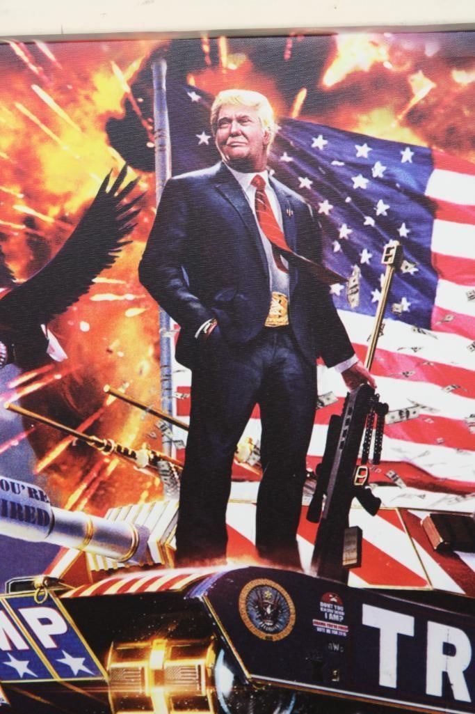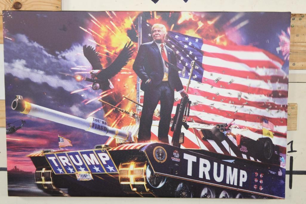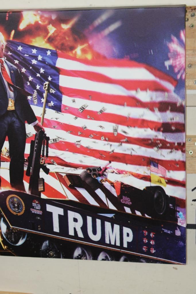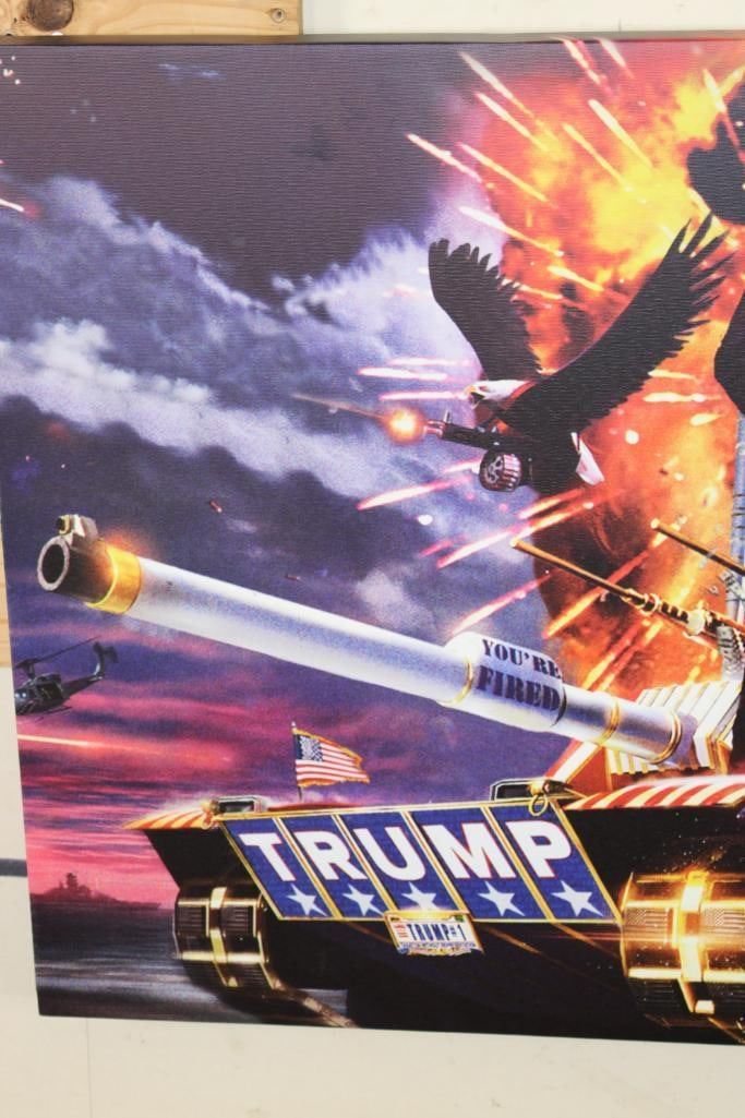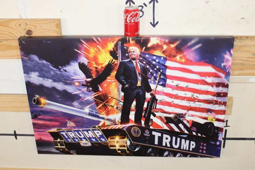President Donald Trump Patriotic Canvas Printed and wrapped onto a wood frame. It measures 3' Wide x 2' Tall. The next Lot is a matching patriotic canvas of Ronald Reagan. PATRIOTIC ART PRINTS