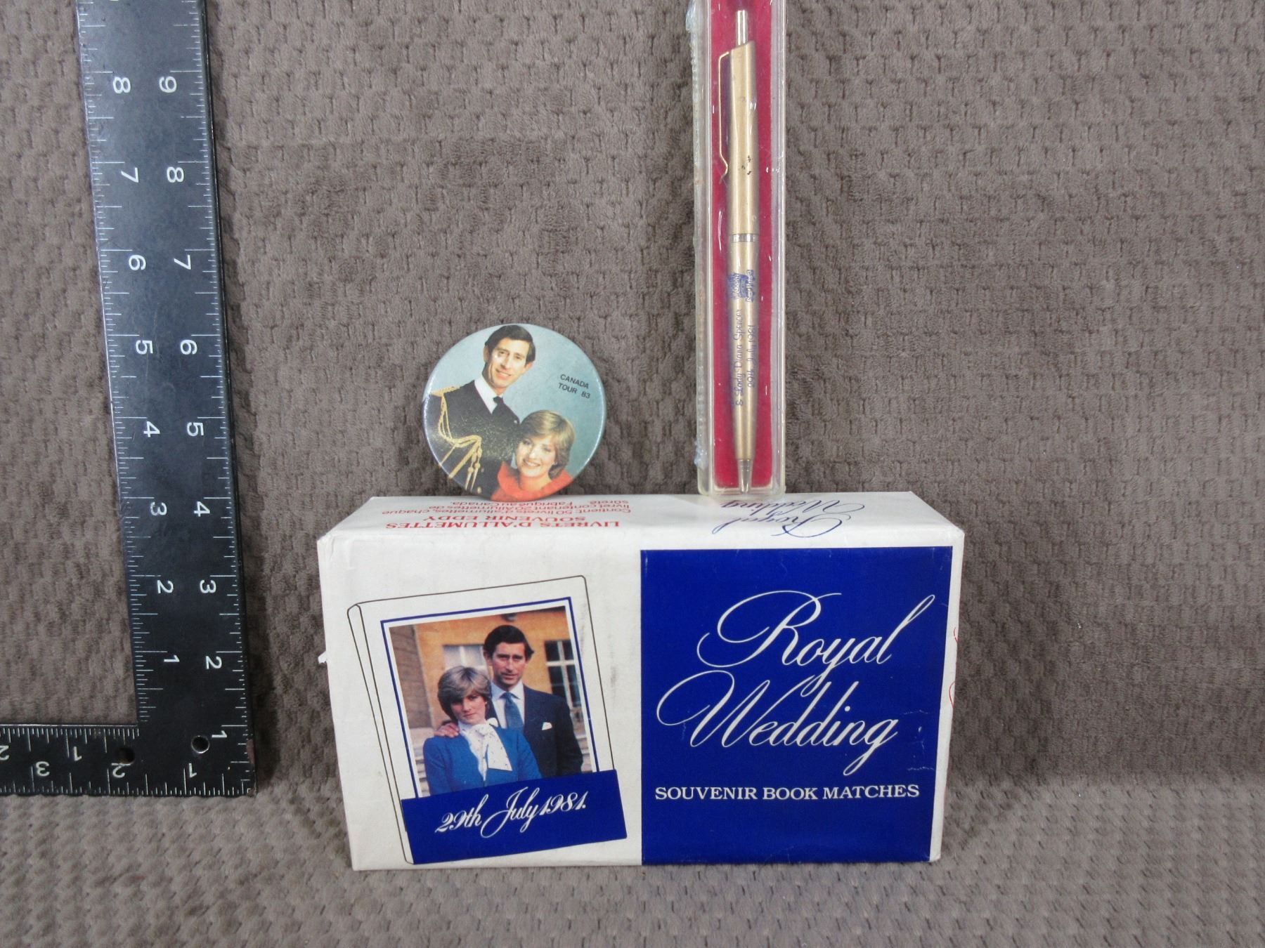 Prince Charles & Princess Diana Wedding Collectibles - Gold Colored Pen, Unopend Box of Souvenir Matches, Pin of Tour of Canada 83,