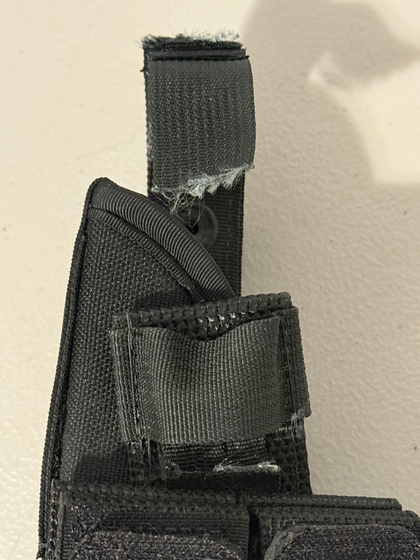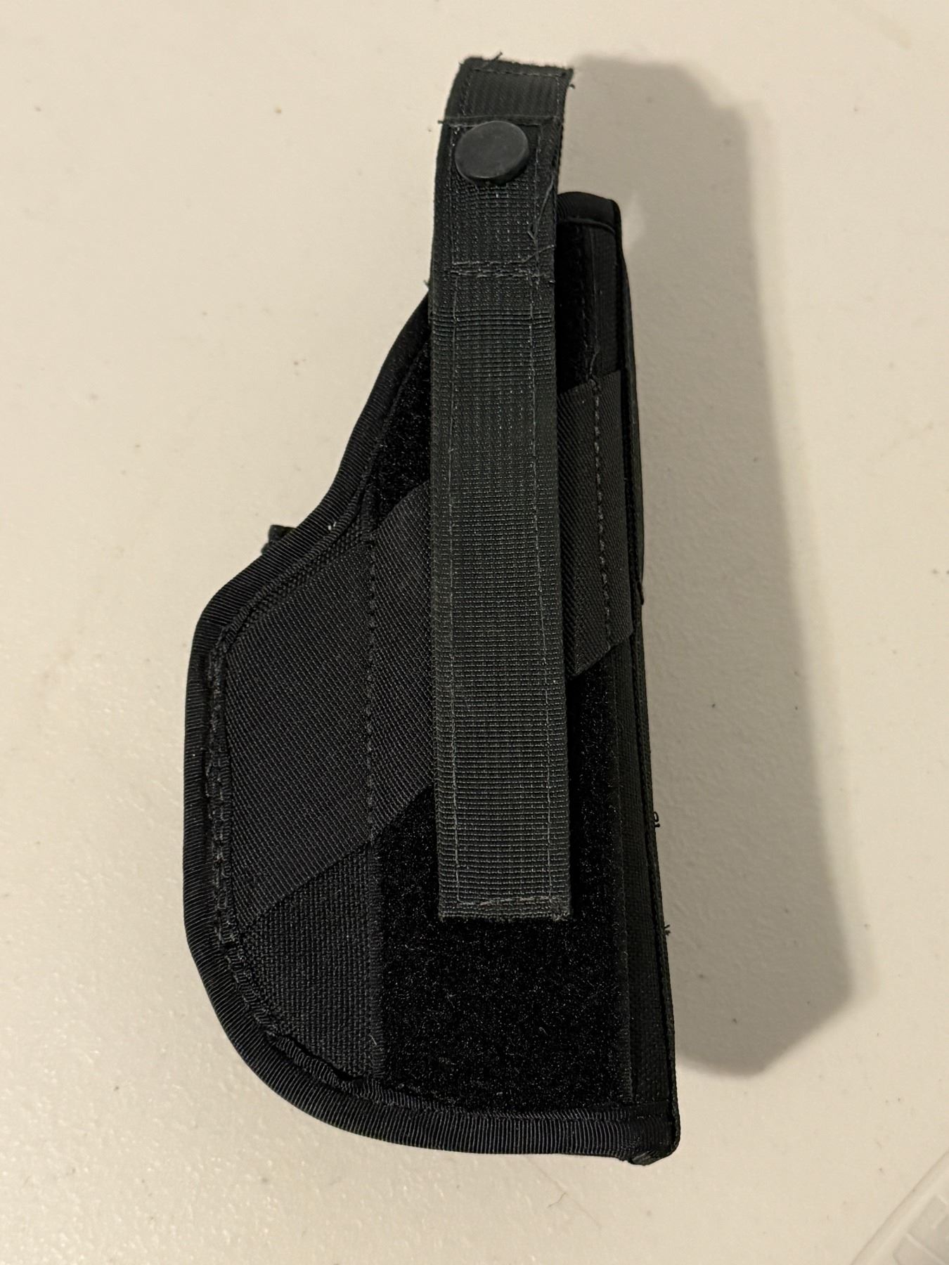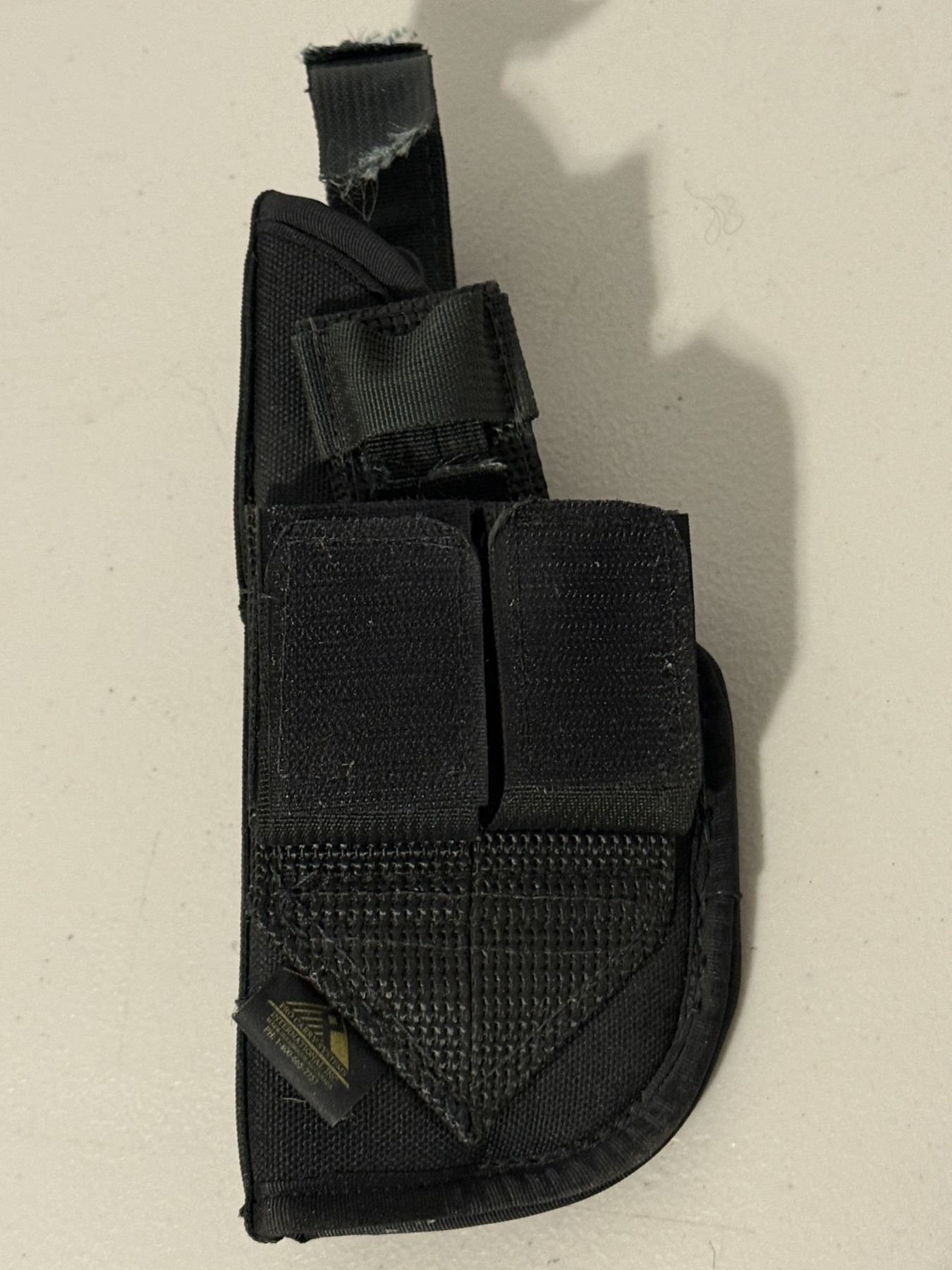 Black nylon belt holster by Pro Carry Systems (International Inc.), made in Canada. Features snap-retention strap and belt loop. Shows damage and fraying on the strap and stitching. Sold as shown.