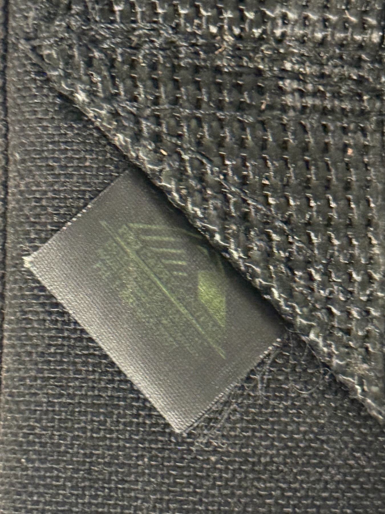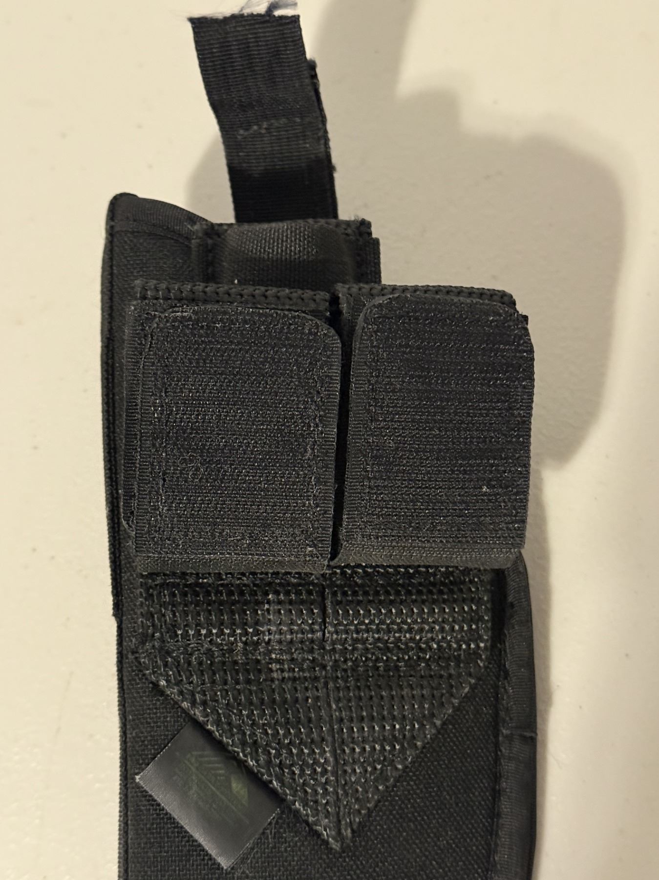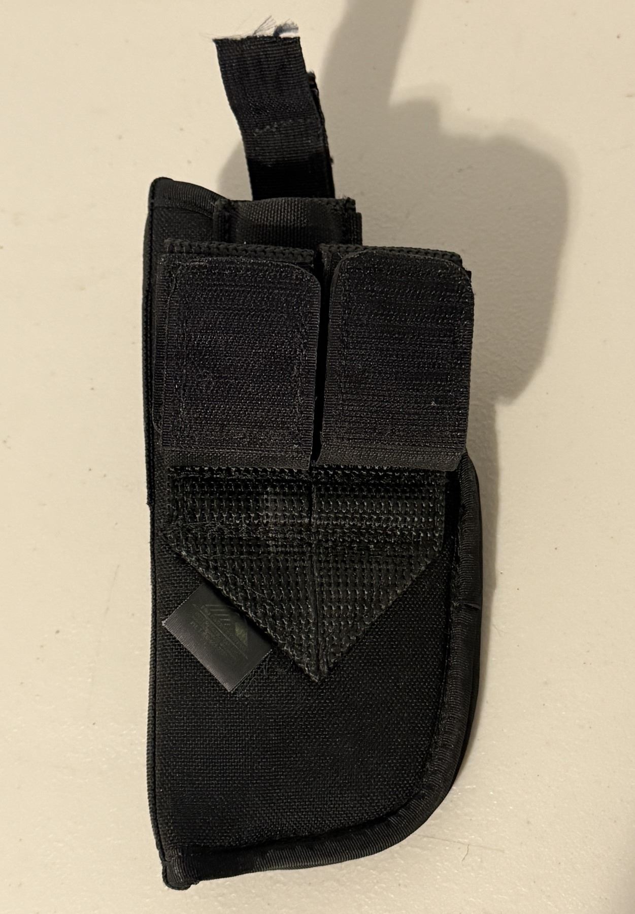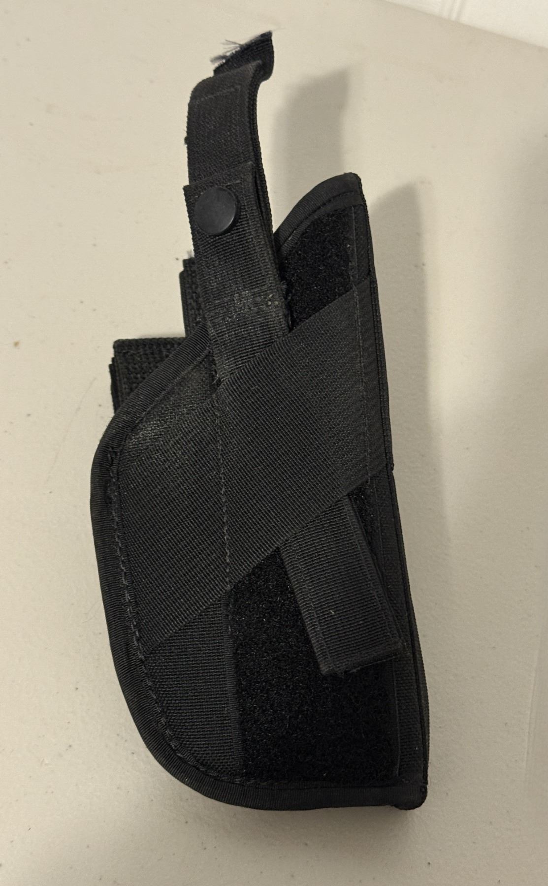 Black nylon belt holster by Pro Carry Systems (International Inc.), made in Canada. Features hook-and-loop retention, snap belt strap, and padded construction. Strap is frayed at the end/damaged. Sold as shown.