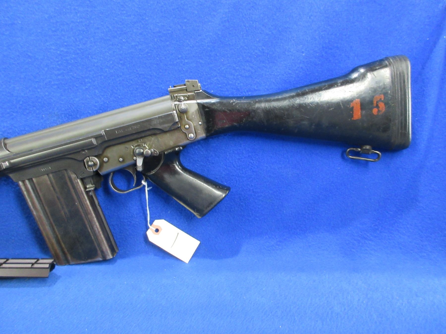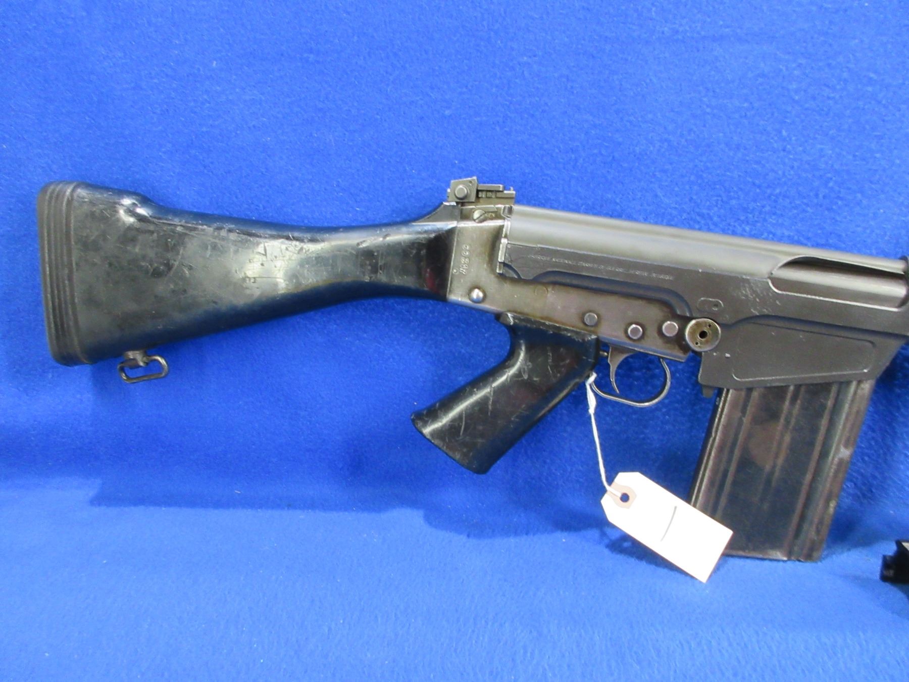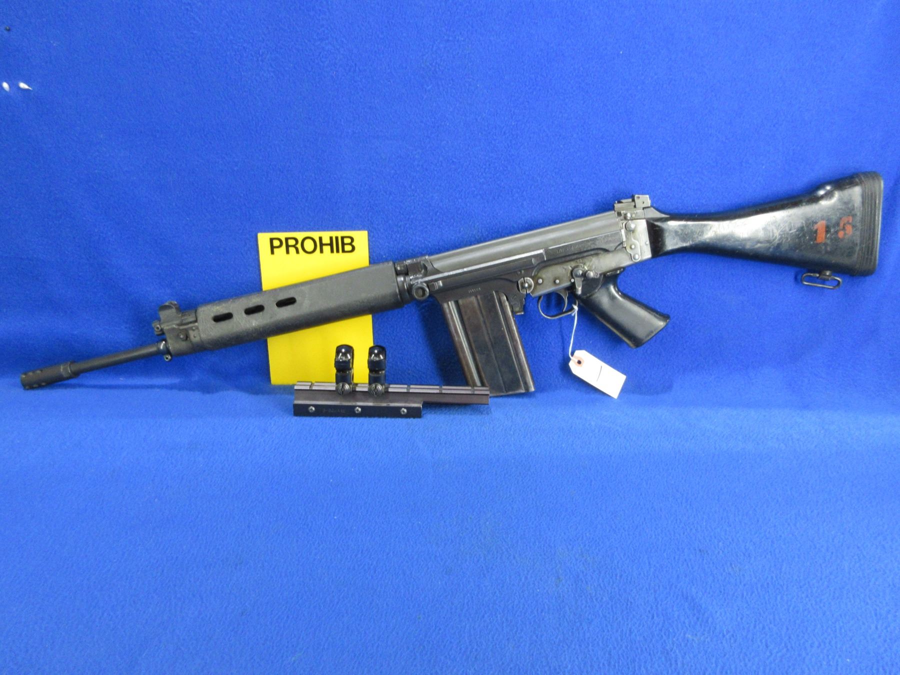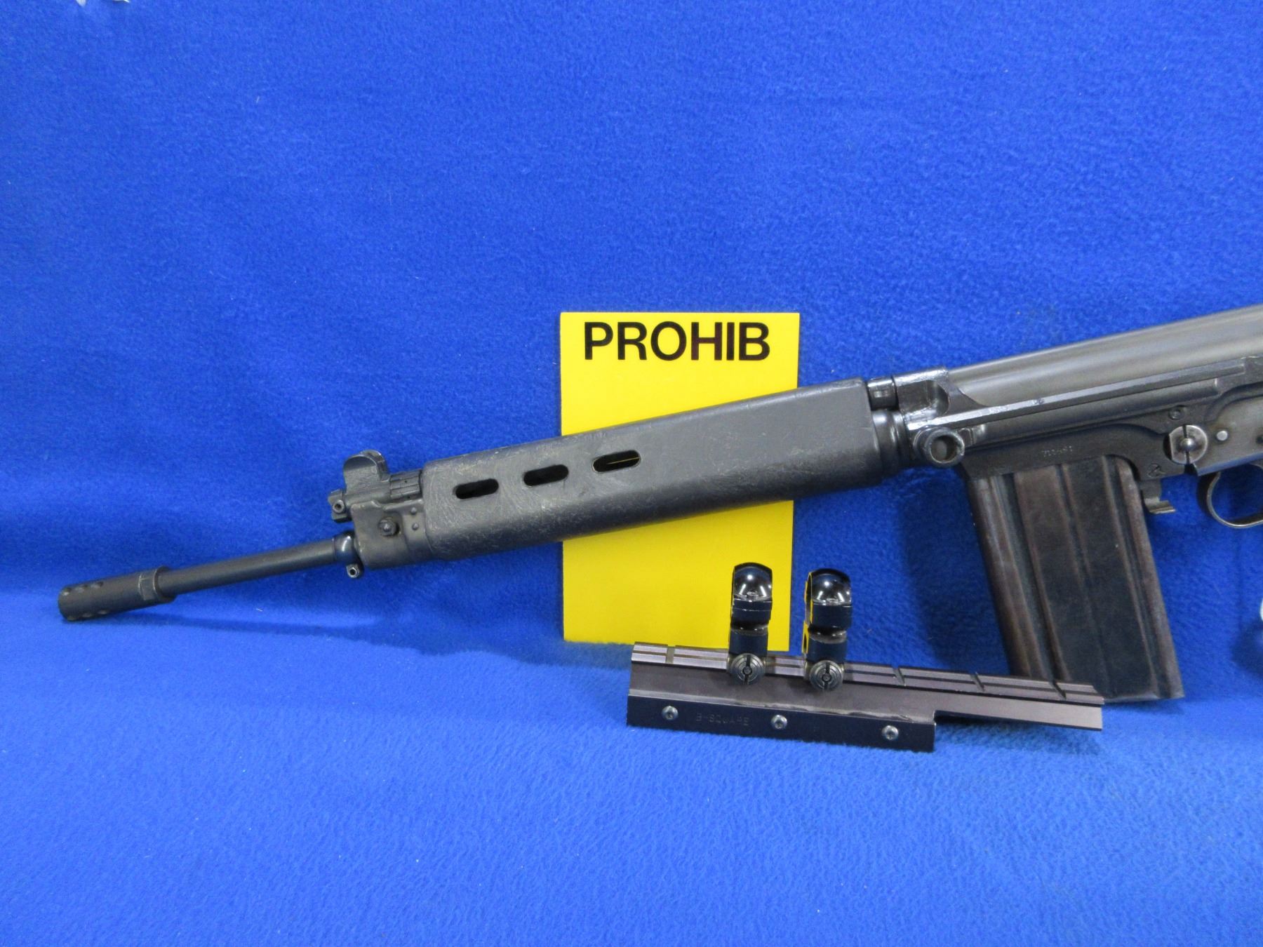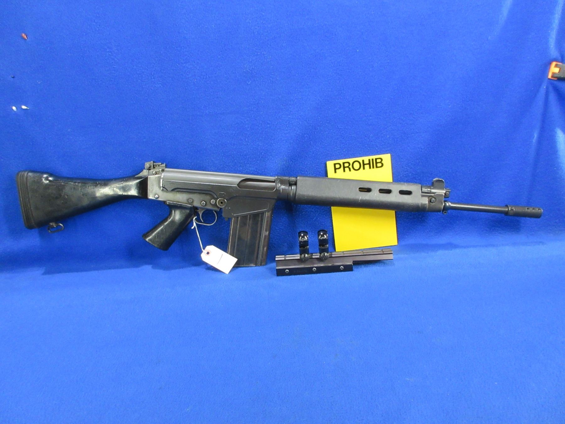 Prohib 12-3 Required - Belgian FN Model FAL in 7.62X51 - This semi-auto rifle with removable magazine appears to be in good to very good working order. Barrel is 480MM, rifling is good to very good, bluing is good to very good, has both sights, synthetic stock and forearm are good with usage marks, rubber pad good. Comes with front swivel band, rear swivel, B-Square rail and 1" rings. Ser # 3773