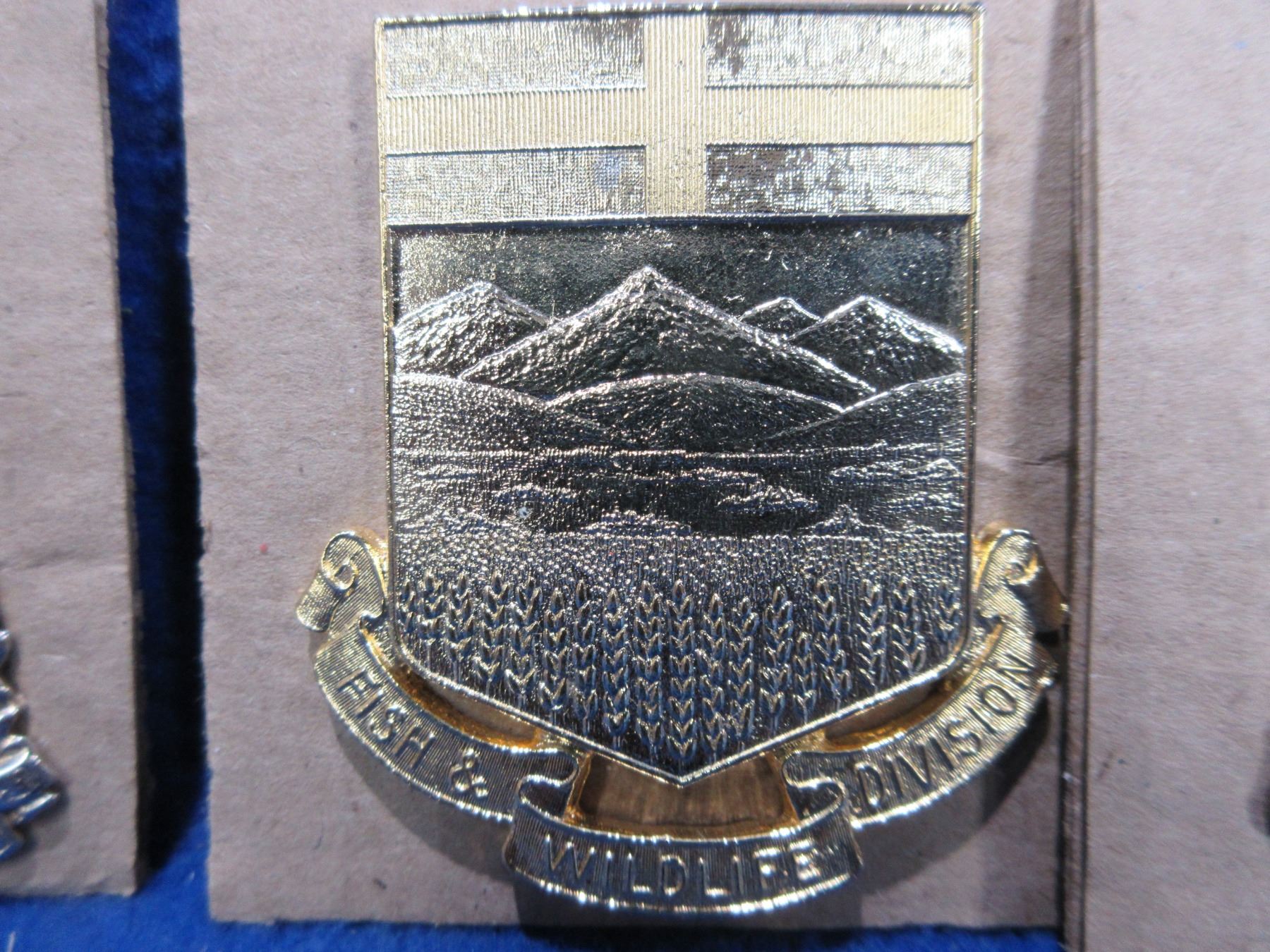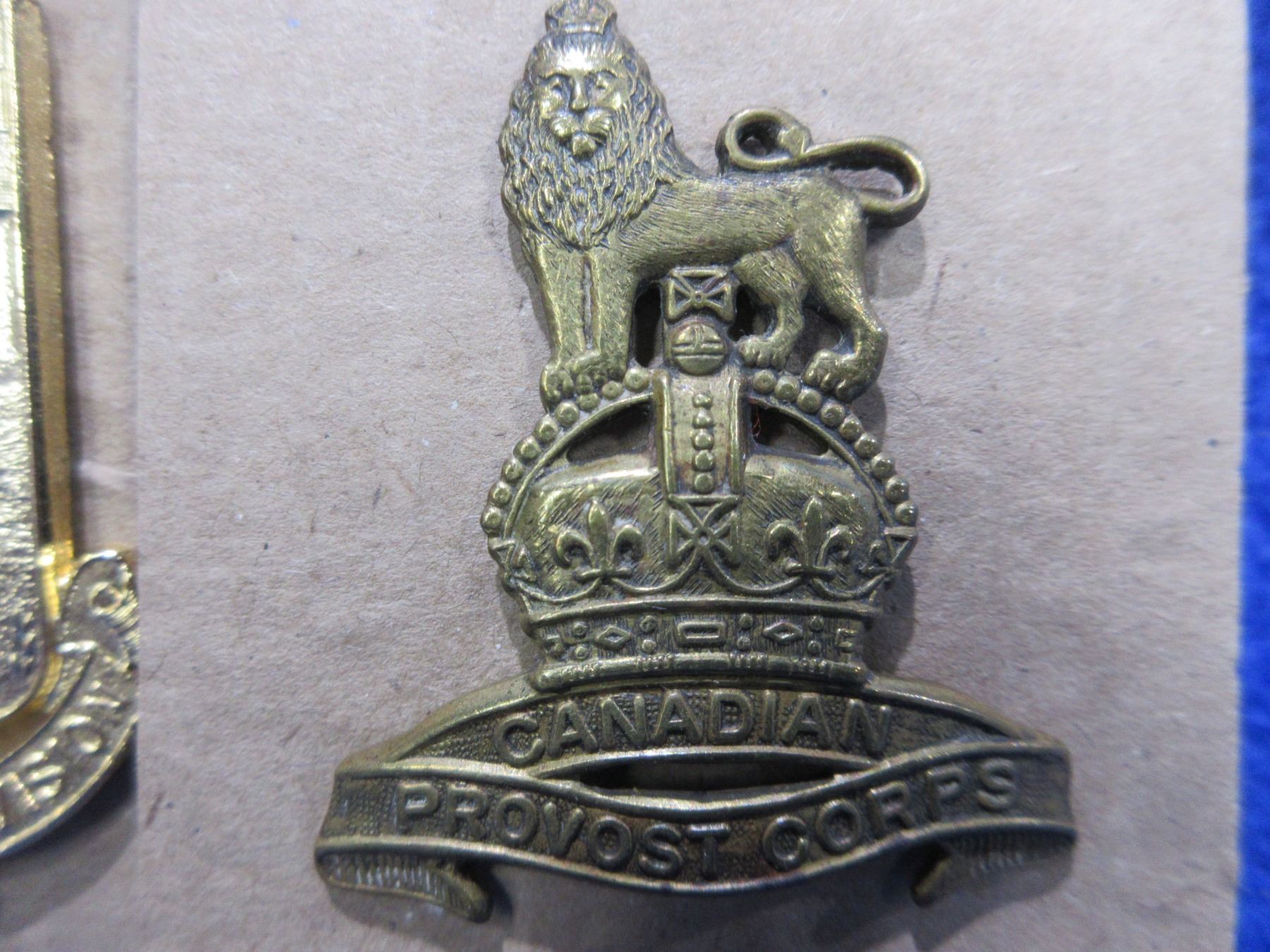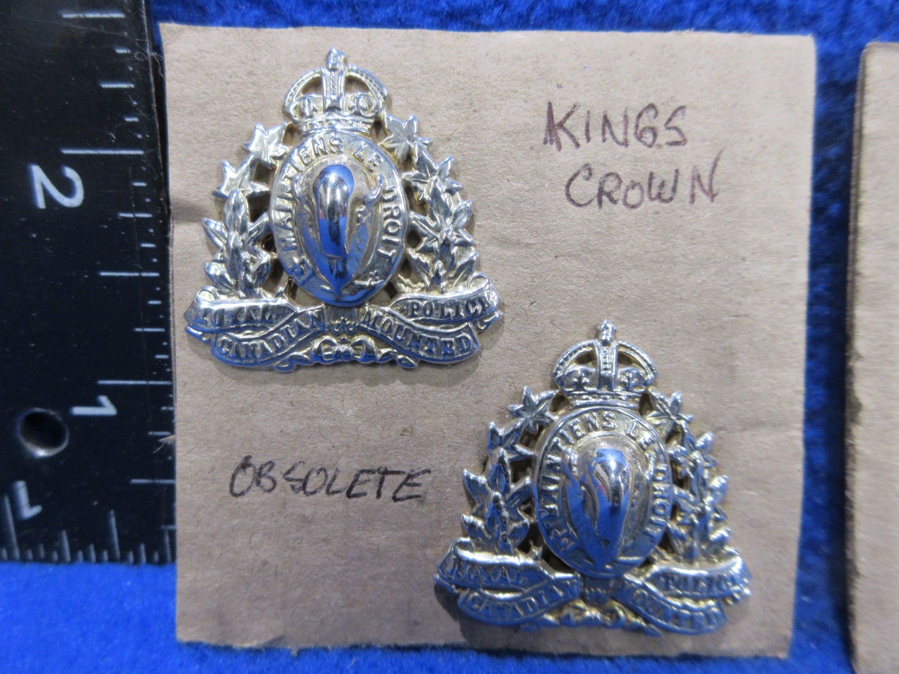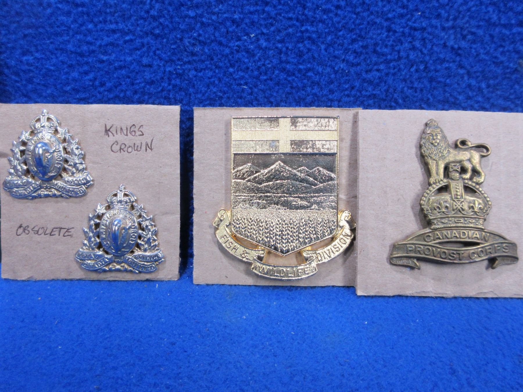 Provost Corps Cap Badge, 2 RCMP Collar Badges, Alberta Fish & Wildlife Badge