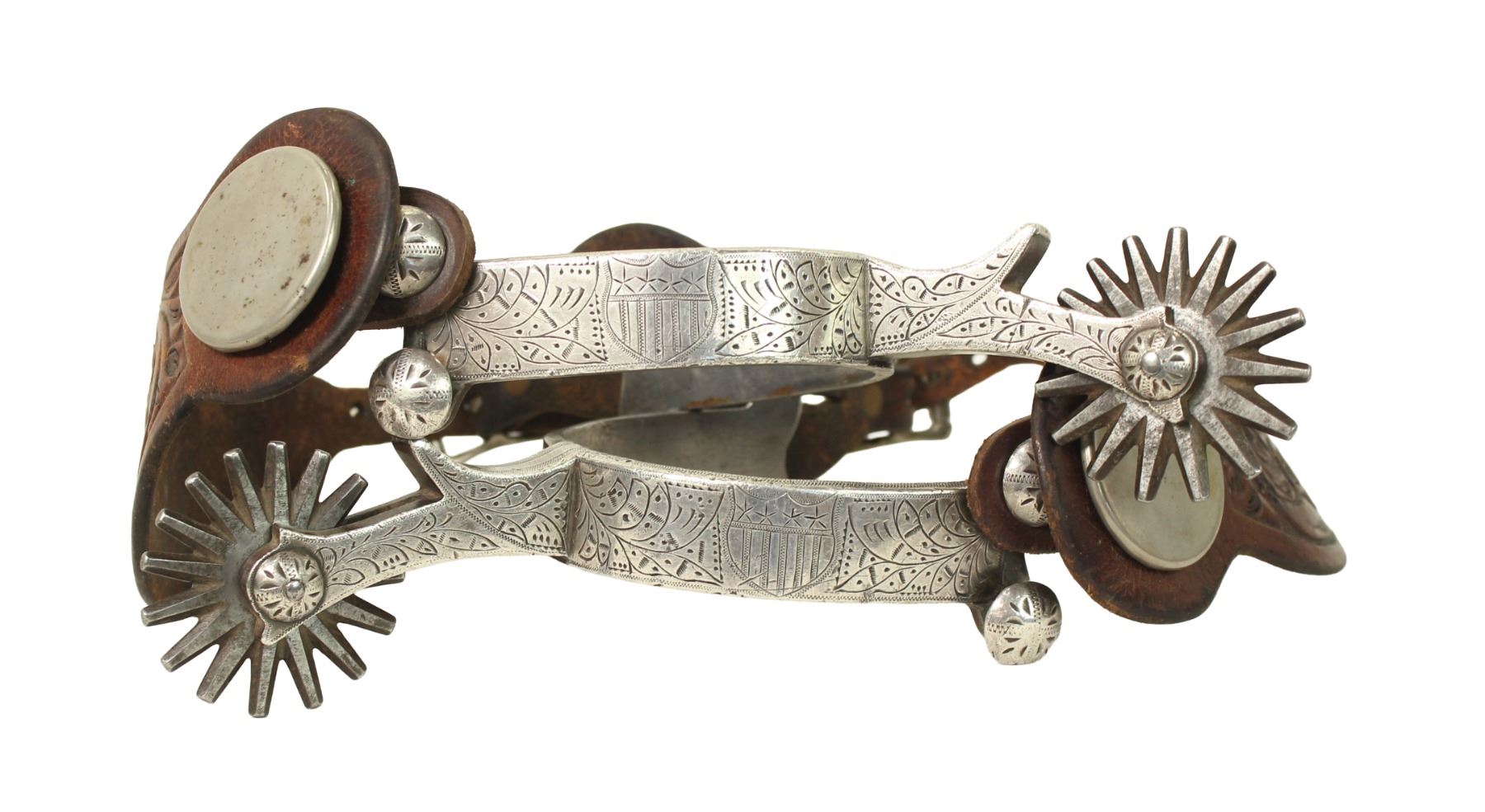 A phenominal pair of excedingly rare spurs, single mounted with a full overlaid sheild pattern, detailed rowels, characteristic double buttons, and finished with wonderful original straps. With nice mark inside heelbands.