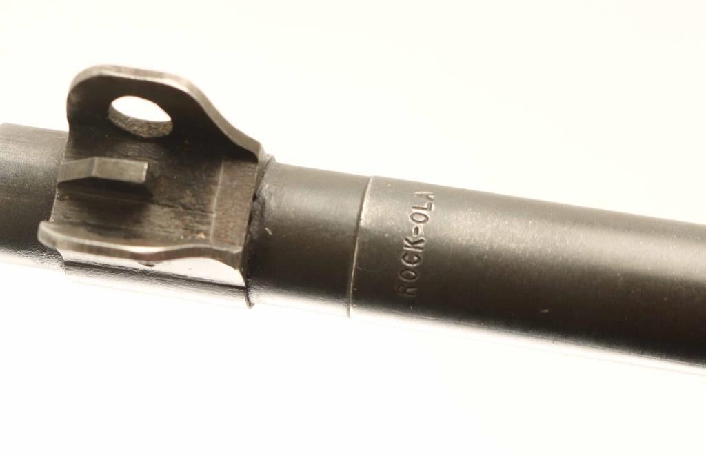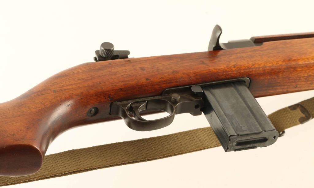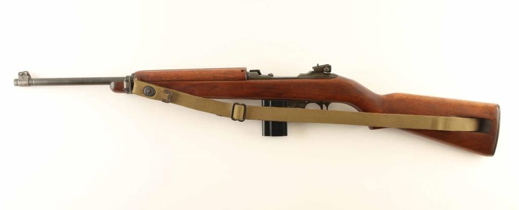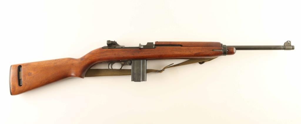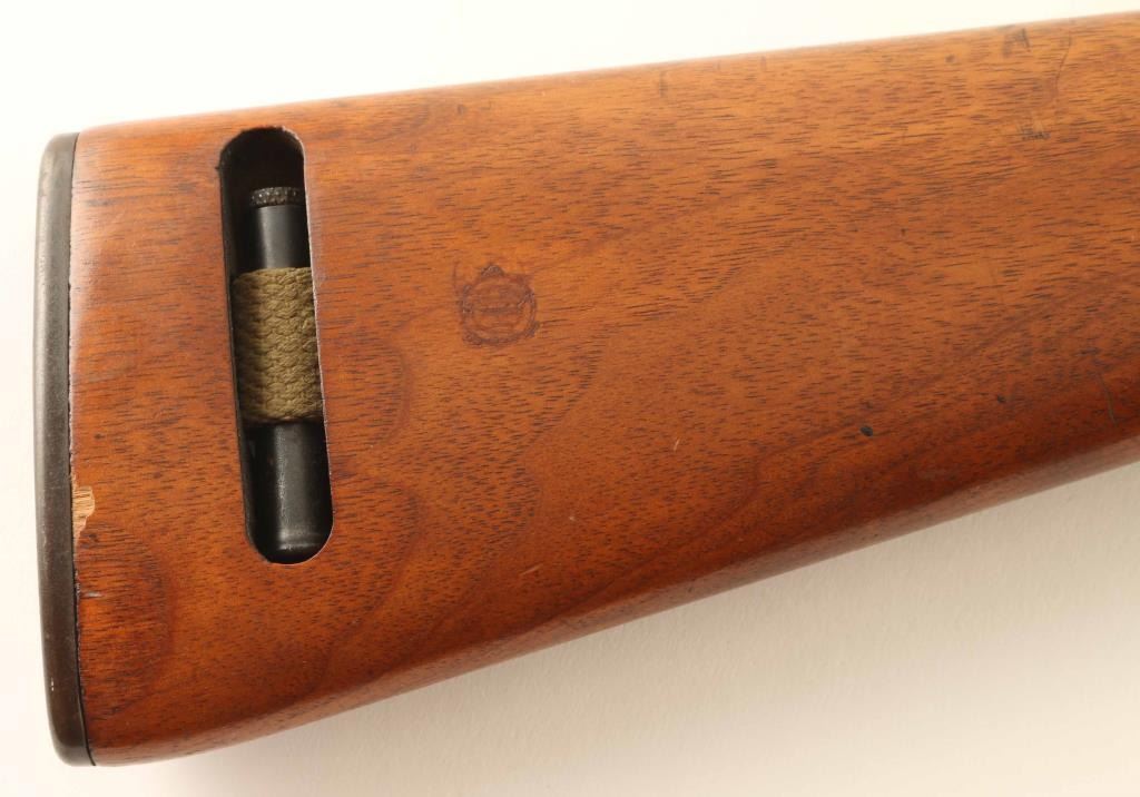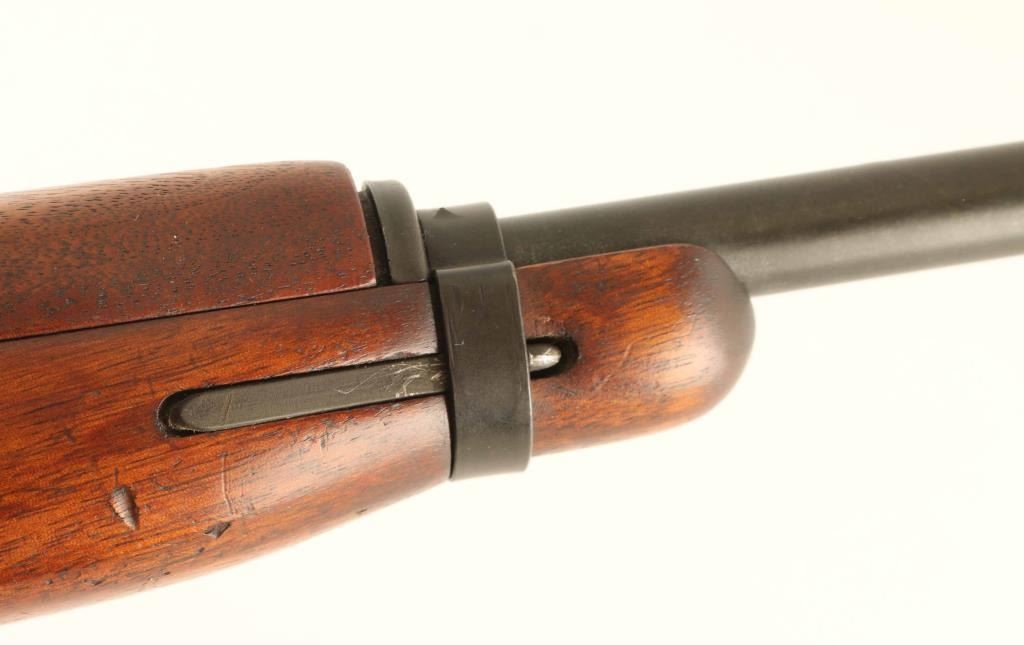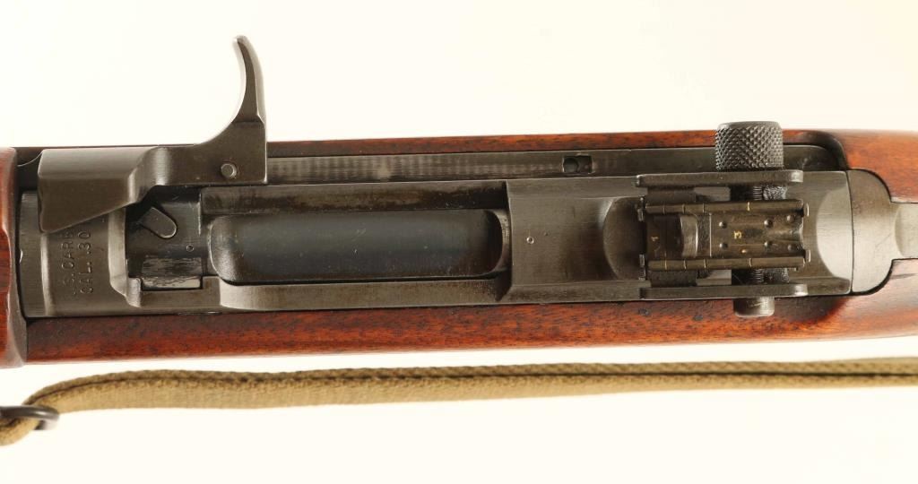 US military semiautomatic rifle. Features parkerized finish, walnut stock & handguard, protected blade front sight, adjustable peep rear sight with sliding elevation adjustments, 18" barrel, manual safety, front sling swivel, sling slot in butt, accepts detachable magazine. Bore is excellent. Retains 90% finish, look is consistent with original wartime colors & textures, finish is thinning or showing bare metal on operating parts such as bolt body & receiver rails, and at high spots near muzzle. Mostly early WWII part variations, such as flat top bolt, early mag catch, 2 rivet handguard, push button safety, no bayonet lug on band. Wood is very good condition, with a smooth and semi gloss appearance, slightly orange tint, some dents and scrapes. Markings include "ROCK-OLA" on barrel, ordnance crossed cannon cartouche on stock. No importer marks observed. Includes one blued steel magazine, proper style olive drab colored web sling & oil bottle. Condition is NRA Very Good ++ *** C&R Firearm ***