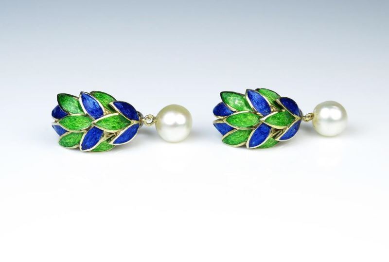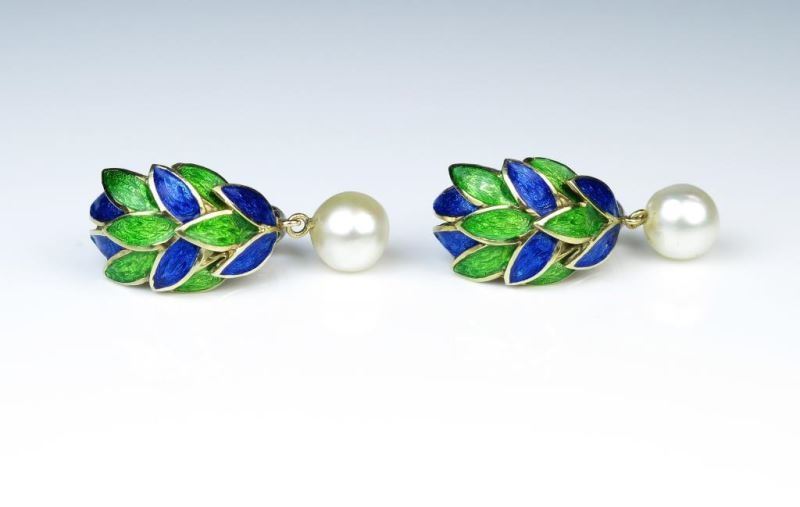 Accented with blue and green enamel set in 14 karat yellow gold setting. Fine craftsmanship.