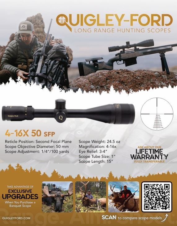 Premier glass for all your hunting and target shooting passions. The 4-16x50 Second Focal Plane (SFP) Quigley-Ford Long Range Scope delivers exceptional clarity and reliable performance for hunters and marksmen. Its reticle remains consistent in size and boldness across all magnification levels, ensuring easy visibility and precise targeting. Optimized for mid- to long-range shots, this scope is ideal for scenarios where accuracy and simplicity are paramount.