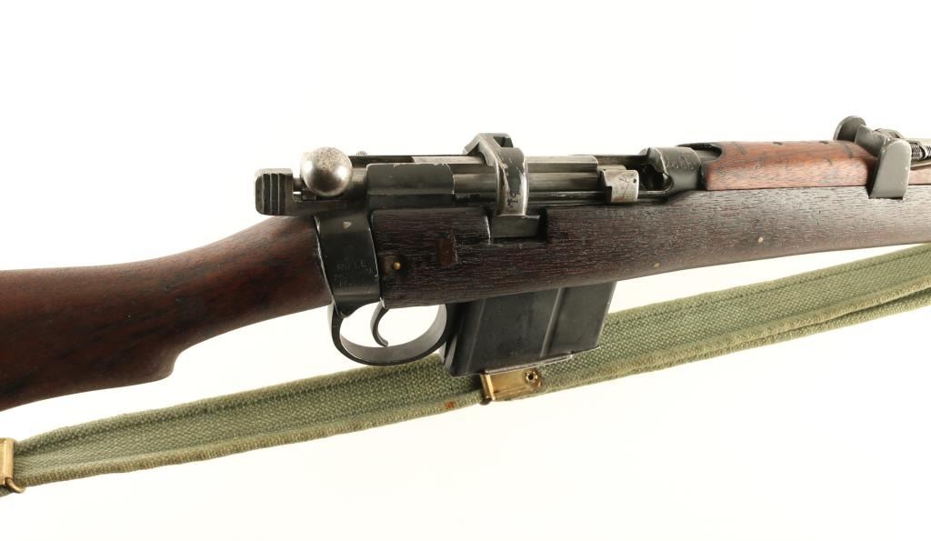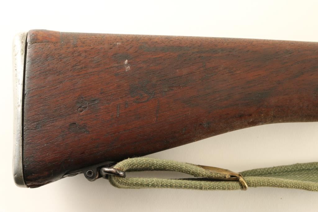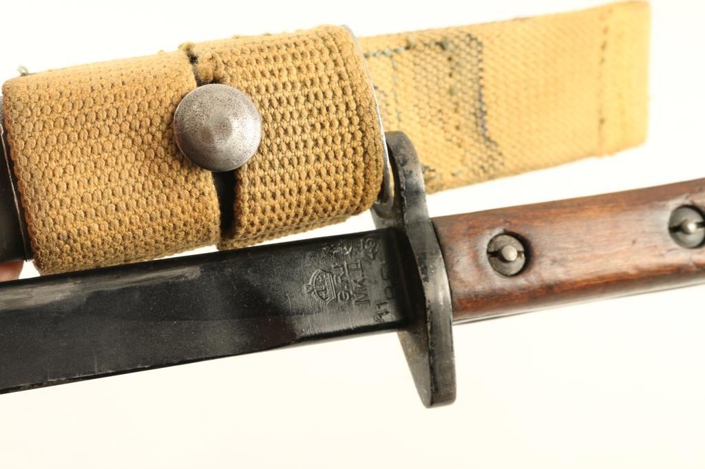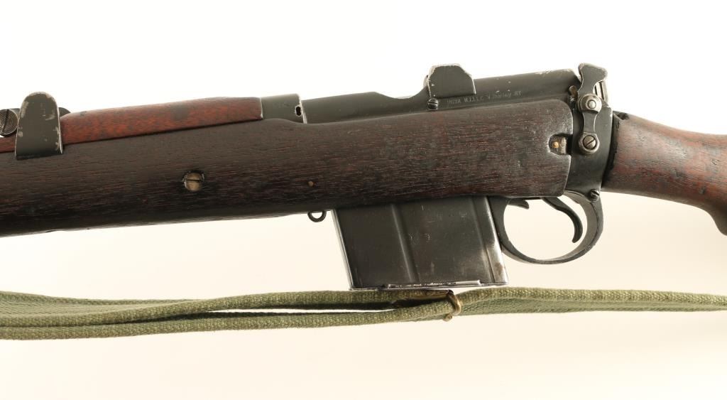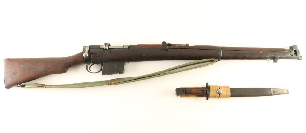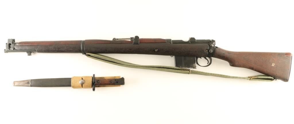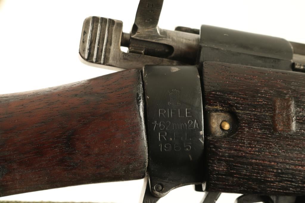Indian military bolt action rifle dated 1965, imported by NI LLC, West Hurley NY. Features black paint finish on metal parts, wood stock & hand guards, straight grip, aluminum butt plate with trapdoor compartment, 25" barrel, blade front & tangent rear sight with protective ears, bayonet lug, sling swivels, manual safety, 10 round detachable magazine, charger bridge. Bore is very good condition. Retains 75% finish with bare metal on sharp edges and where handled frequently. Wood is good condition, with repair piece at comb of butt. Number "12" in white paint 1/2" tall on left side of butt. Includes good condition green webbing Commonwealth style brass hook sling, "RFI" marked bayonet dated 1943. Bayonet is very good condition with leather scabbard & tan web hanger. Condition is NRA Very Good *** C&R Firearm ***