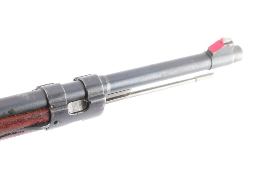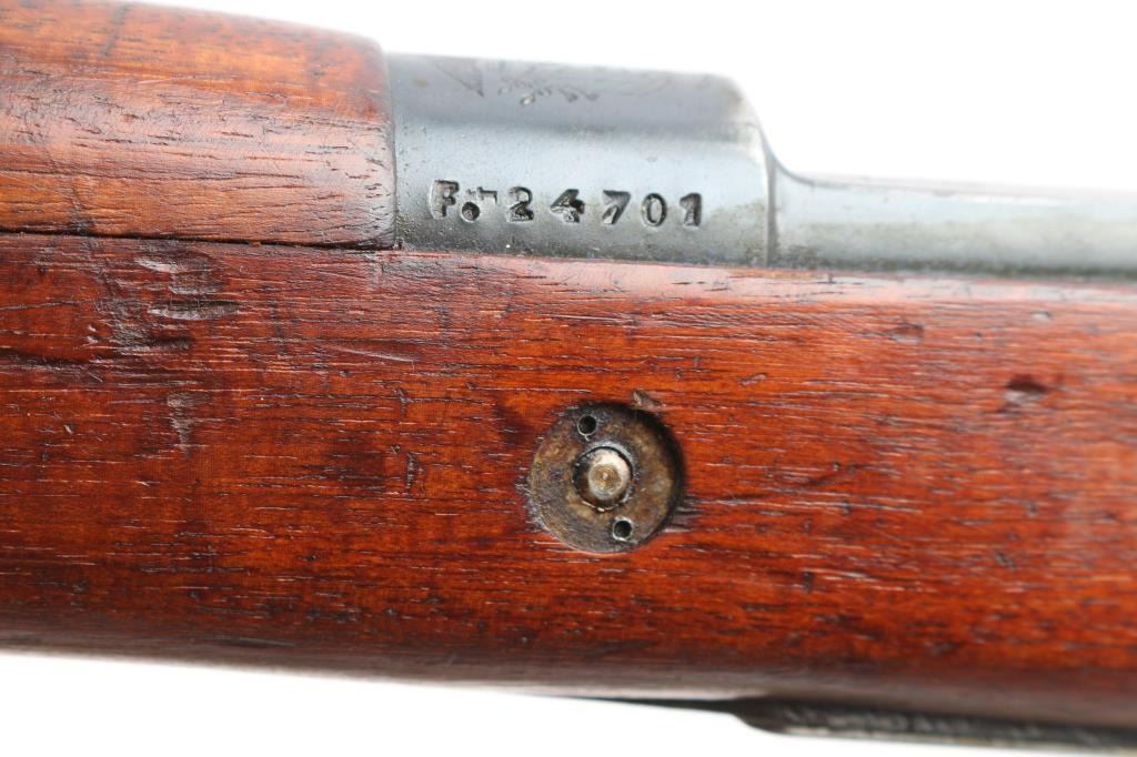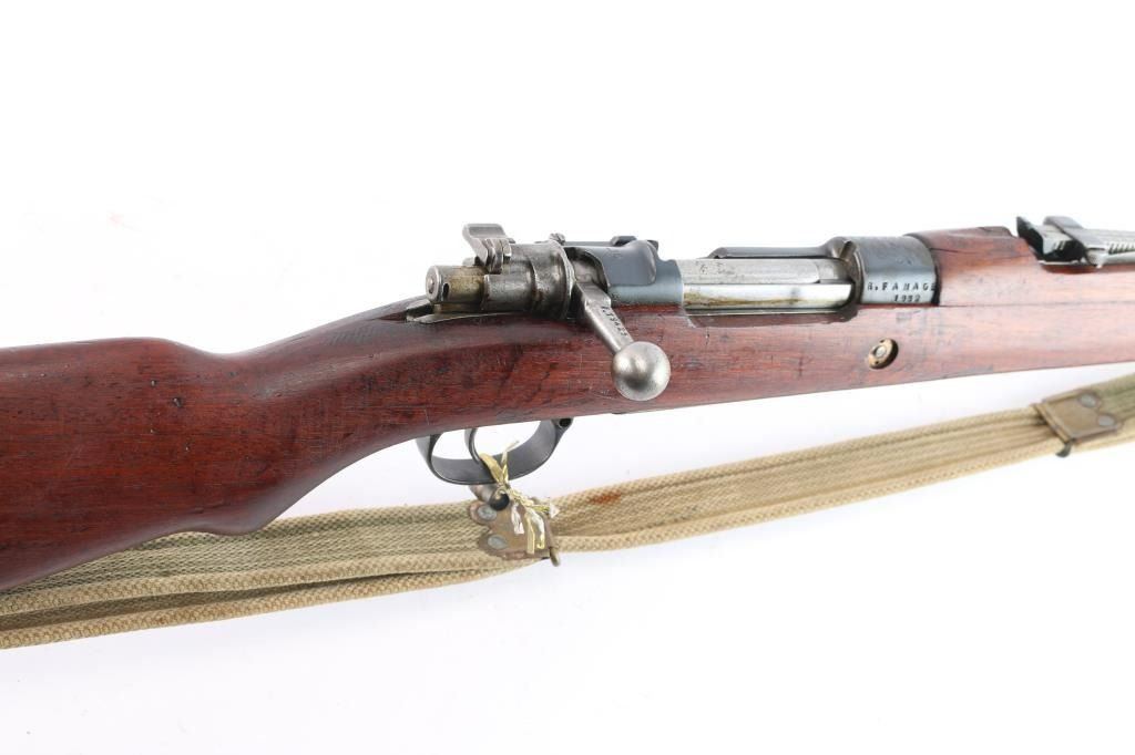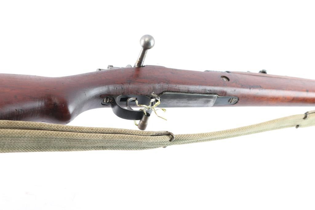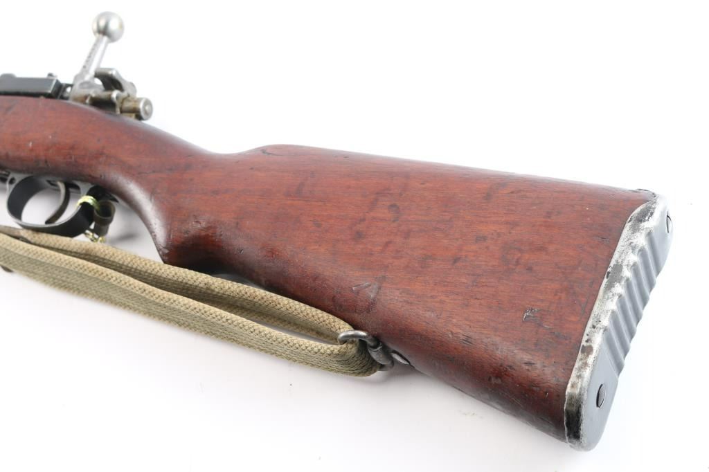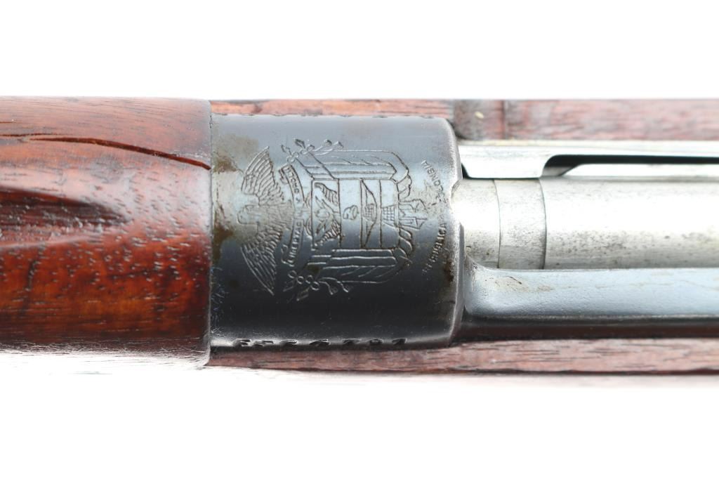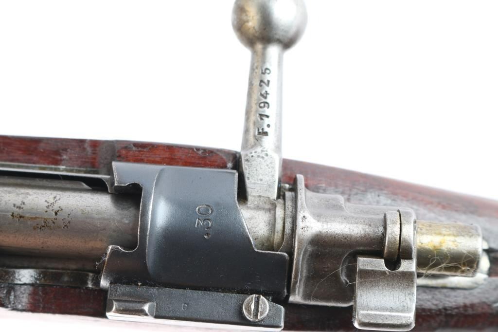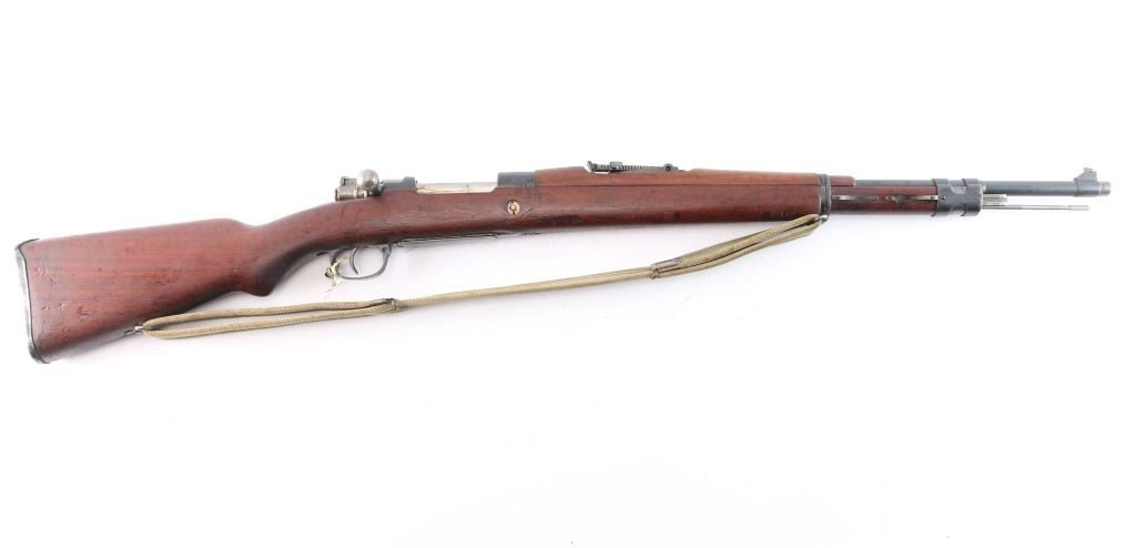 Columbian converted bolt-action rifle rechambered in 30-06 Spring an marked .30 on rear of receiver. 1952 dated receiver with the Columbian Coat of Arms. Blued finish, and the bolt is in-the-white. Wood semi-pistol grip stock and matching handguard, smooth curved trigger, sling swivels, ribbed sheet metal buttplate, approximately 23.5" barrel, 'H' style front barrel band, marked with importer CAI, St. Albans, VT, and 'MOD 98 Belgium' on barrel. Inverted "V" front sight and is painted red, tangent adjustable rear sight graduated to 2000 meters. Non-matching serial numbers. Retains about 80% of original bluing, with some scattered finish wear. Some handling/edge wear on the metal, some pitting on the front of the barrel, and also on the bolt. Wood is good with normal handling wear, handguard is cracked between the receiver and rear sight. Action is smooth/tight. Bore appears to be bright with good rifling, and comes with a fabric sling