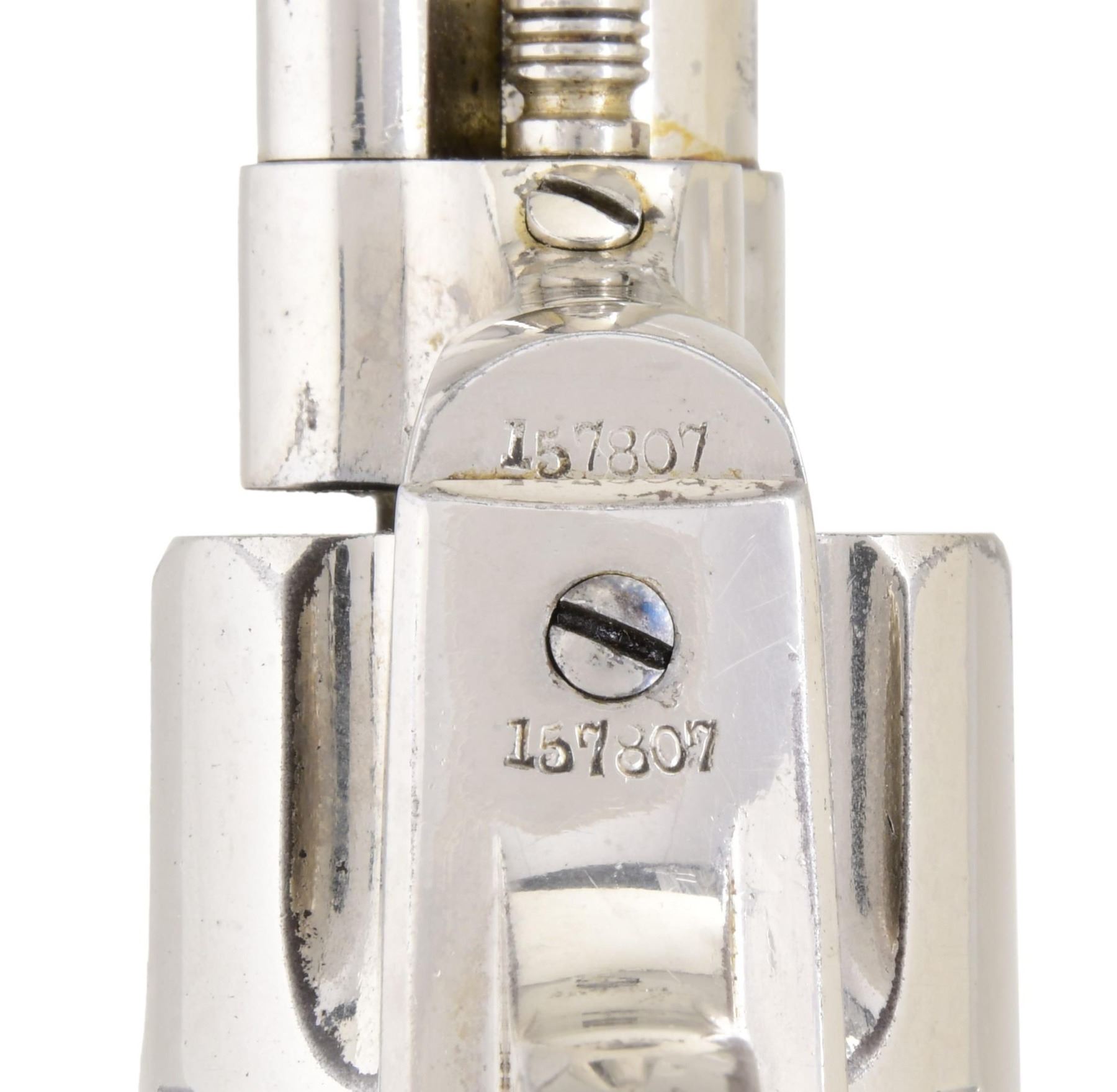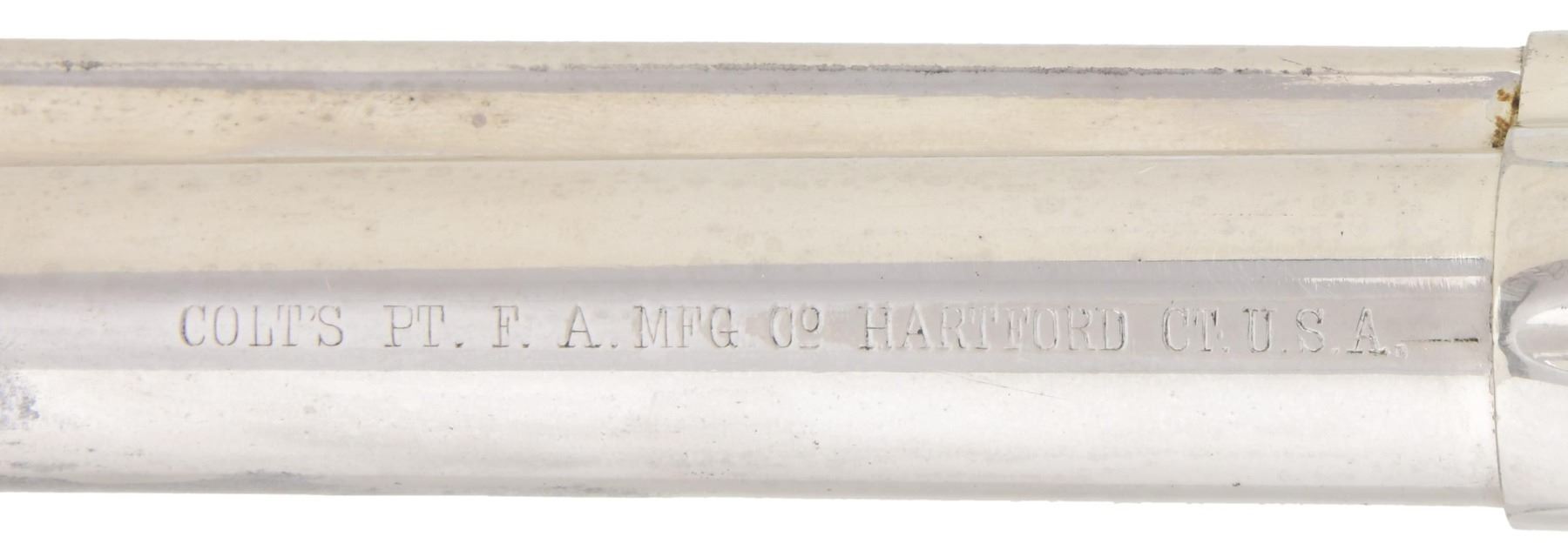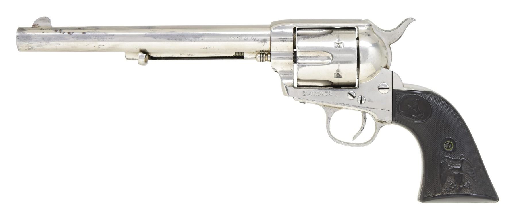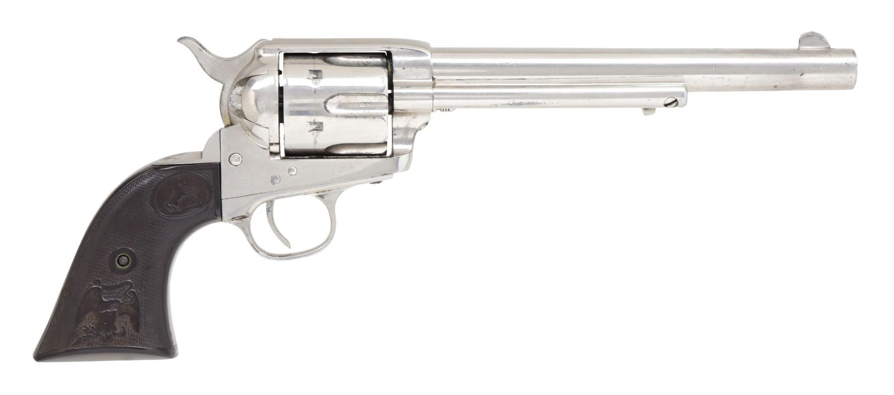 Cal. 44 S&W. S# 157807. Standard configuration nickel plated, 7.5" barrel, one line Hartford address, stamped on right side "44-S & W" denoting rare S&W Russian 44 caliber, checkered Colt logo hard rubber eagle grips. This revolver was made in 1894 and one of only nine single action army revolvers in this rare caliber shipped that year. (Wilkerson & Hoyt). UNATTACHED ACCESSORIES: Colt factory archive letter confirming configuration of this rare single action, shipped to August 28th 1894, nickel, 7.5" barrel, 44 Russian caliber, stocks not listed. Shipped to George Worthington Co., Cleveland OH as part of 6 revolver shipment. George Worthington (1813-1871) started his large wholesale hardware company in 1829 and of 1990 was oldest continuous running company in Cleveland, OH. CONDITION: very good to fine overall, all matching good discernible markings, retains about 95% re-nickeled finish. Mechanically sound, good rifled bore . PROVENANCE: Martin Lane Historic & Western Americana Lifetime Collection. (01-24623/JS). ANTIQUE. $3,000-5,000.