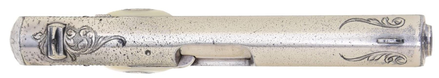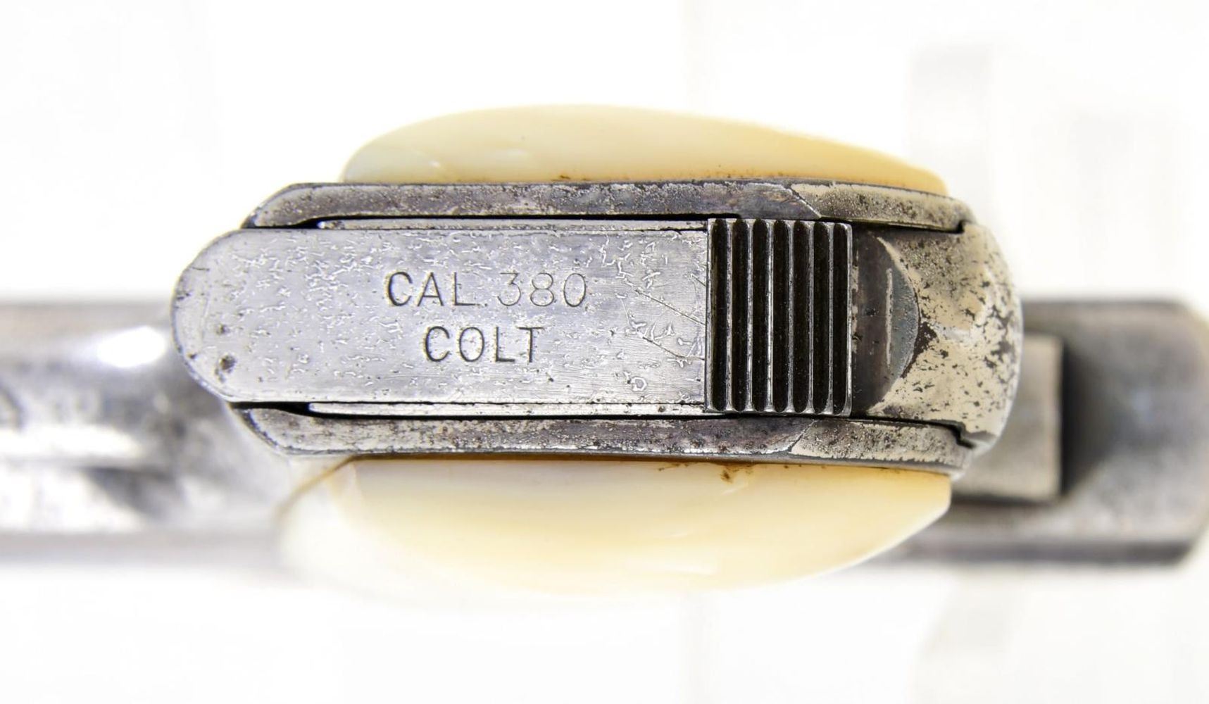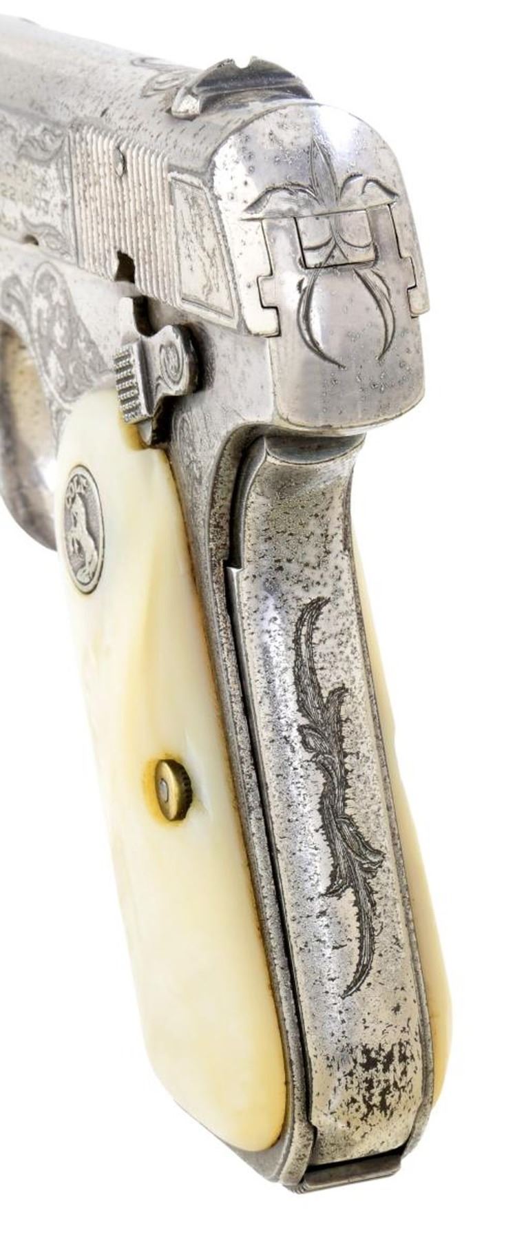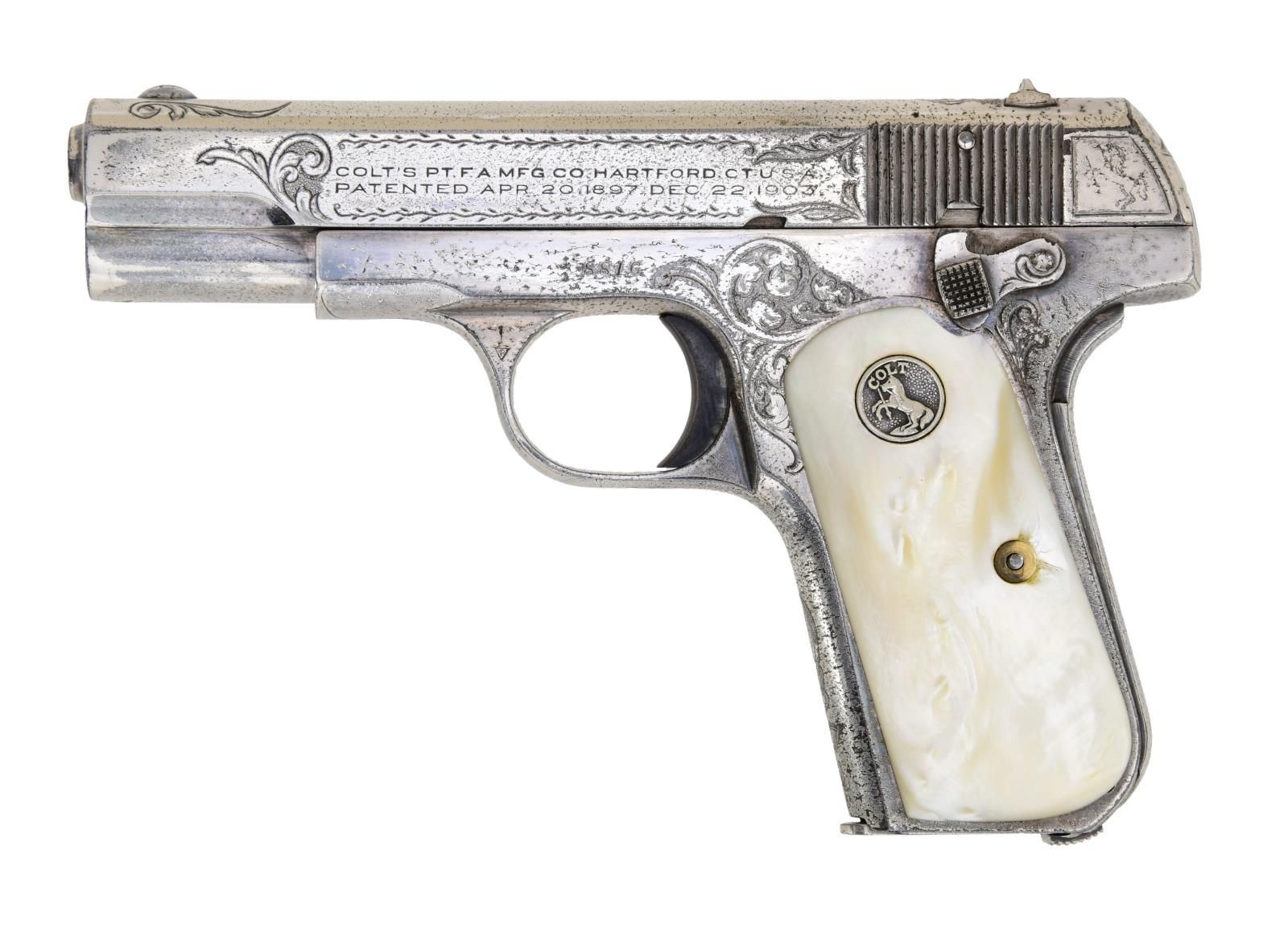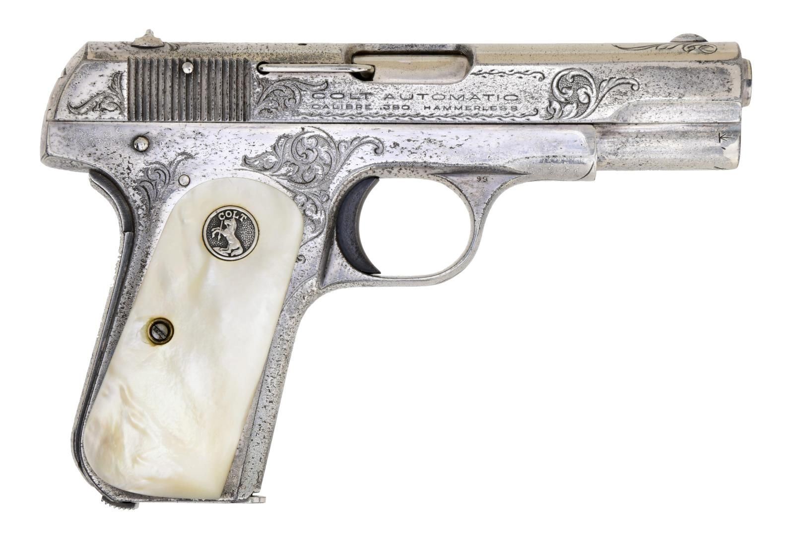 COLT 1908 HAMMERLESS POCKET SEMI AUTO PISTOL WITH PEARL GRIPS & FACTORY LETTER. Cal. 380 ACP. S# 88163. Bbl. 3 3/4". Seldom encountered in any condition, John Brunner states in the Spring 1995 article published in The Rampant Colt (page 57), "303 in caliber 380 were engraved". Article additionally states that a mere 19 of the 380s we silver plated beginning with S# 8962 in 1911. Sides of frame, slide, front and back straps accented with Class A style floral scroll engraving with punch dot background. Pistol is stocked with 2 piece mother of pearl grips having Rampant Colt medallions. UNATTACHED ACCESSORIES: Colt Archive letter stating the following: Serial Number: 88163/ Caliber: 380/c/ Barrel Length: 3 3/4"/ Finish: Silver/ Type of stocks: Pearl/ Factory Engraved: Yes/ Sold To: Hirsch Mercantile Company/ Address: Unavailable/ Shipped to: Baker, Hamilton & Pacific Company/ Address: San Francisco, California/ Date of Shipment: September 23, 1925/ Colt Factory Order: # 10285/ 1/ Number of Same Type Guns in Shipment: 1". Photocopies of 2 pages from John Brunner article featured in Spring 1995 edition of "Rampant Colt" magazine. MAGS: one 7 rd. silver plated mag. CONDITION: Frame retains 70% of its original delicate silver finish with flaking & crazing. Slide retains approx. 40% factory silver with areas of flaked finish showing to start of light pin prick oxidation to bare metal. Grips are sound with missing chips around escutcheons at both sides. Bore shows strong rifling with light frosting in grooves. Mechanically excellent. (24-2217/BH). CURIO. $8,000-14,000.